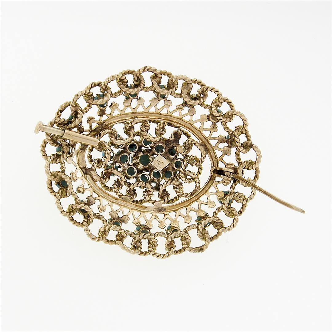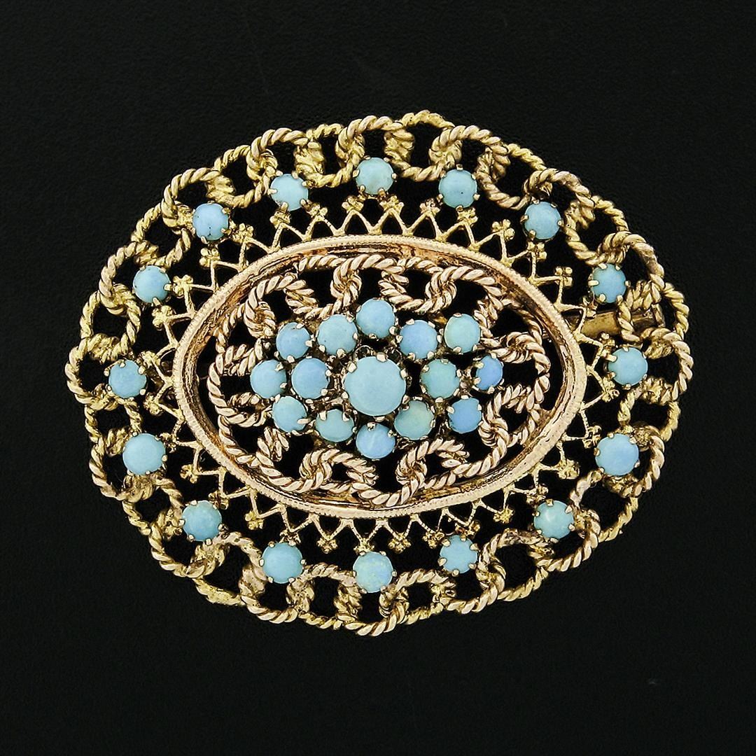 A vintage solid 14k yellow gold pin brooch, with 1 round cabochon cut natural trquoise (4.45mm), and 30 round cabochon cut natural turquoise (2.8mm to 3.2mm). Measures 38.70x47.19mm and weighs a total of 13.80 grams.