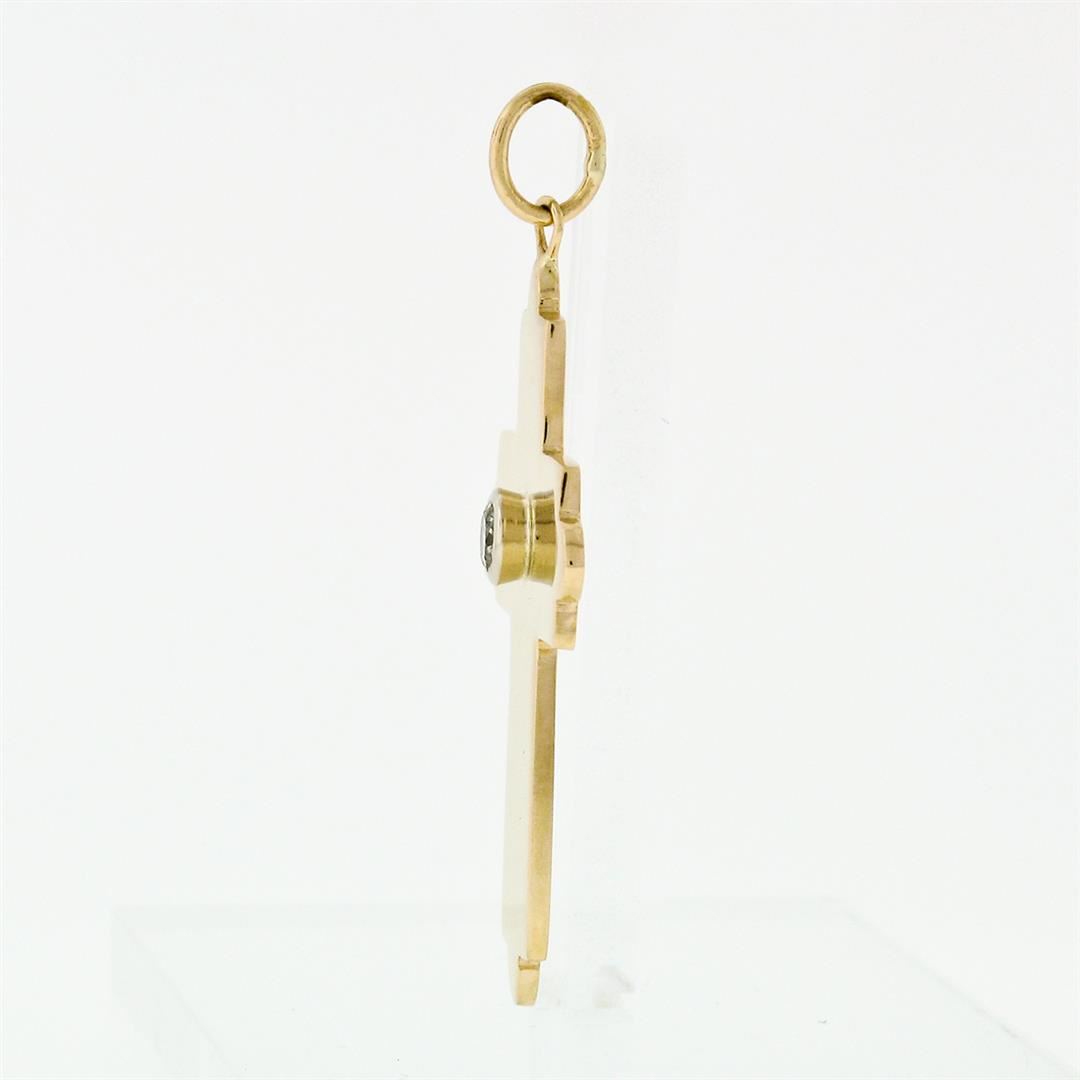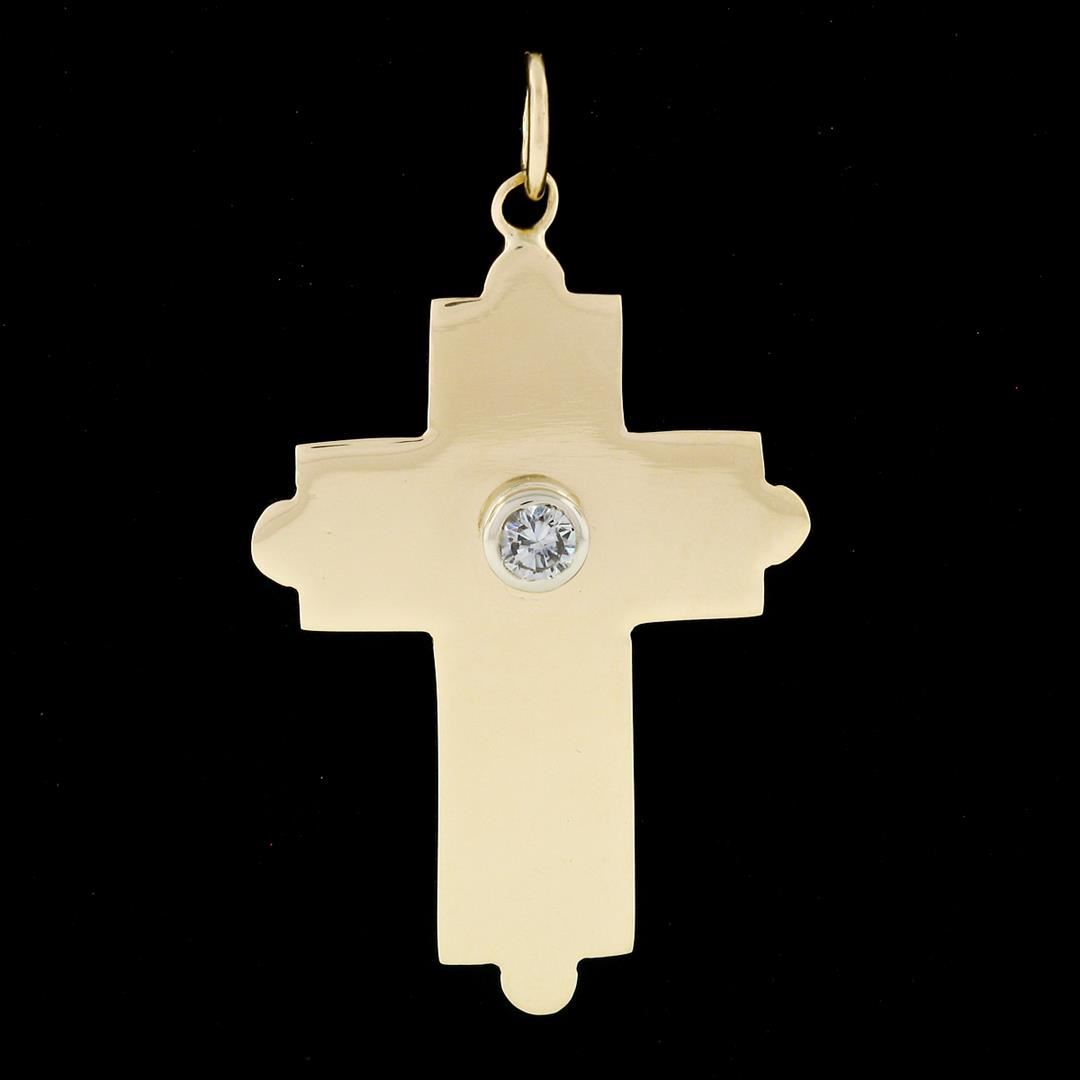 A vintage solid 14k yellow gold cross pendant, with 1 old transitional cut natural diamond (G - VS1 ; 0.15ct). The pendant weighs a total of 3.65 grams, measures 36.90x20.70mm including the bail, and the inside of the bail measures 3.70x3.0mm.