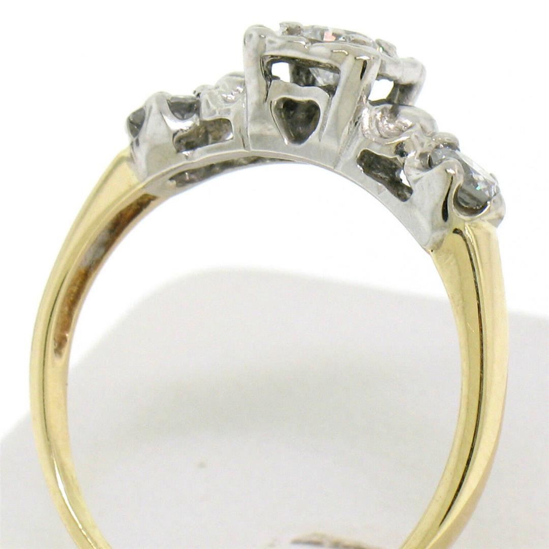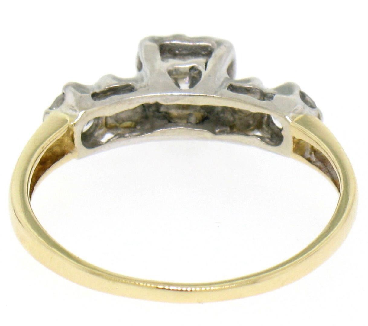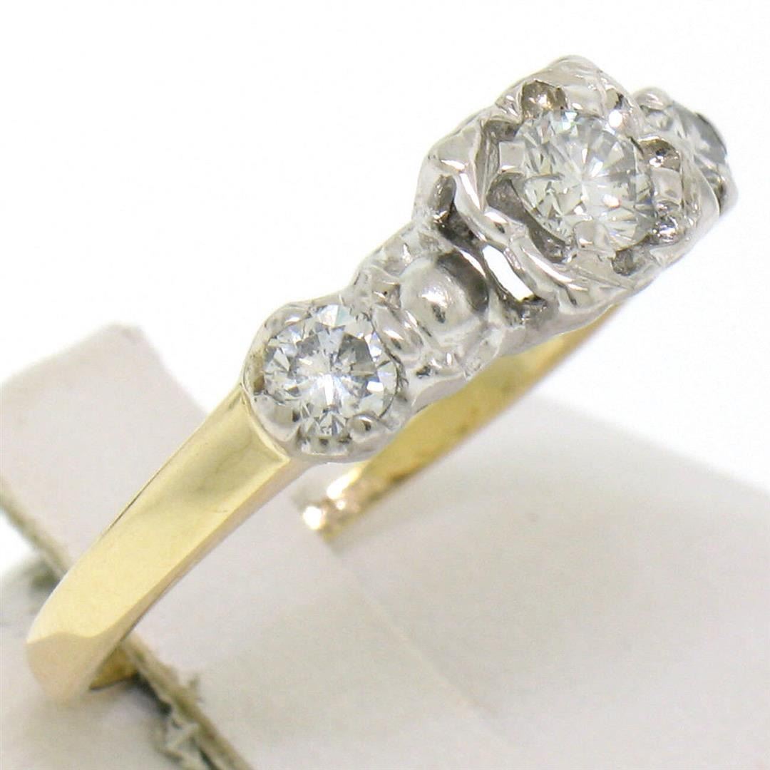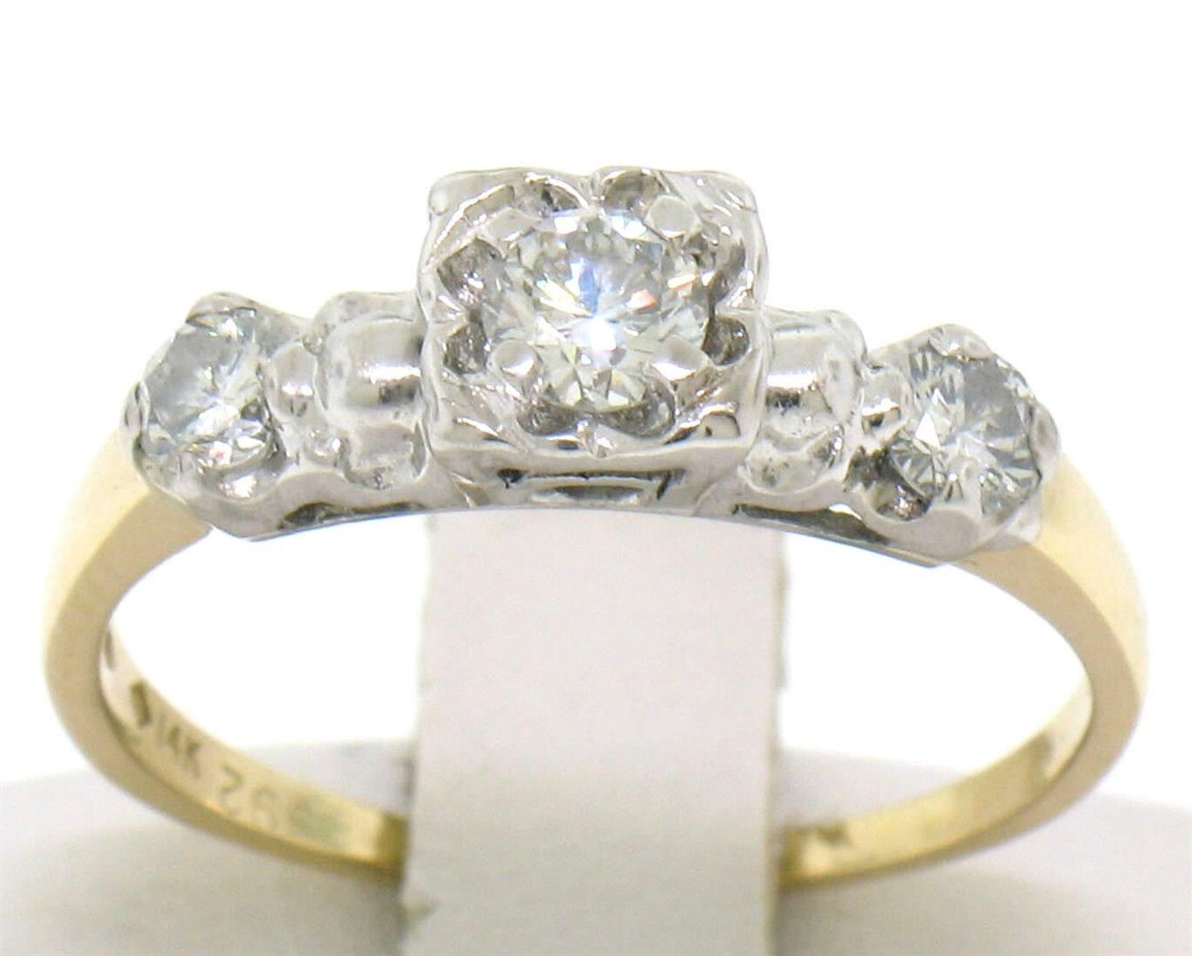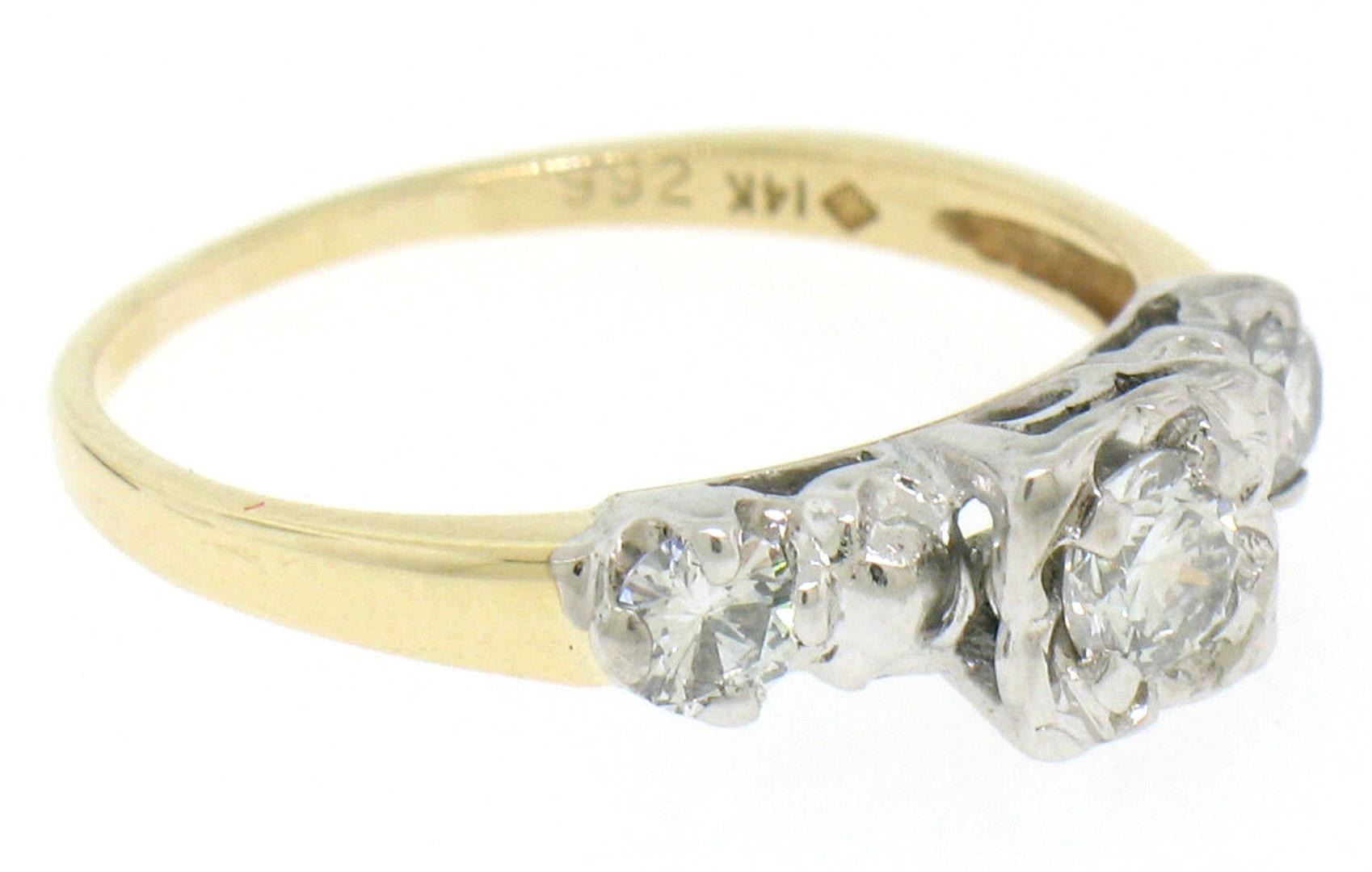 A vintage solid 14k yellow and white gold three stones ring, with 1 round brilliant cut natural diamond (F/G - VS2/SI1 ; 0.20ct), and 2 round brilliant cut natural diamonds (F/G - VS2/SI1 ; 0.20ctw). The ring is size 6.25, weighs a total of 2.10 grams, and measures 5.65mm wide.