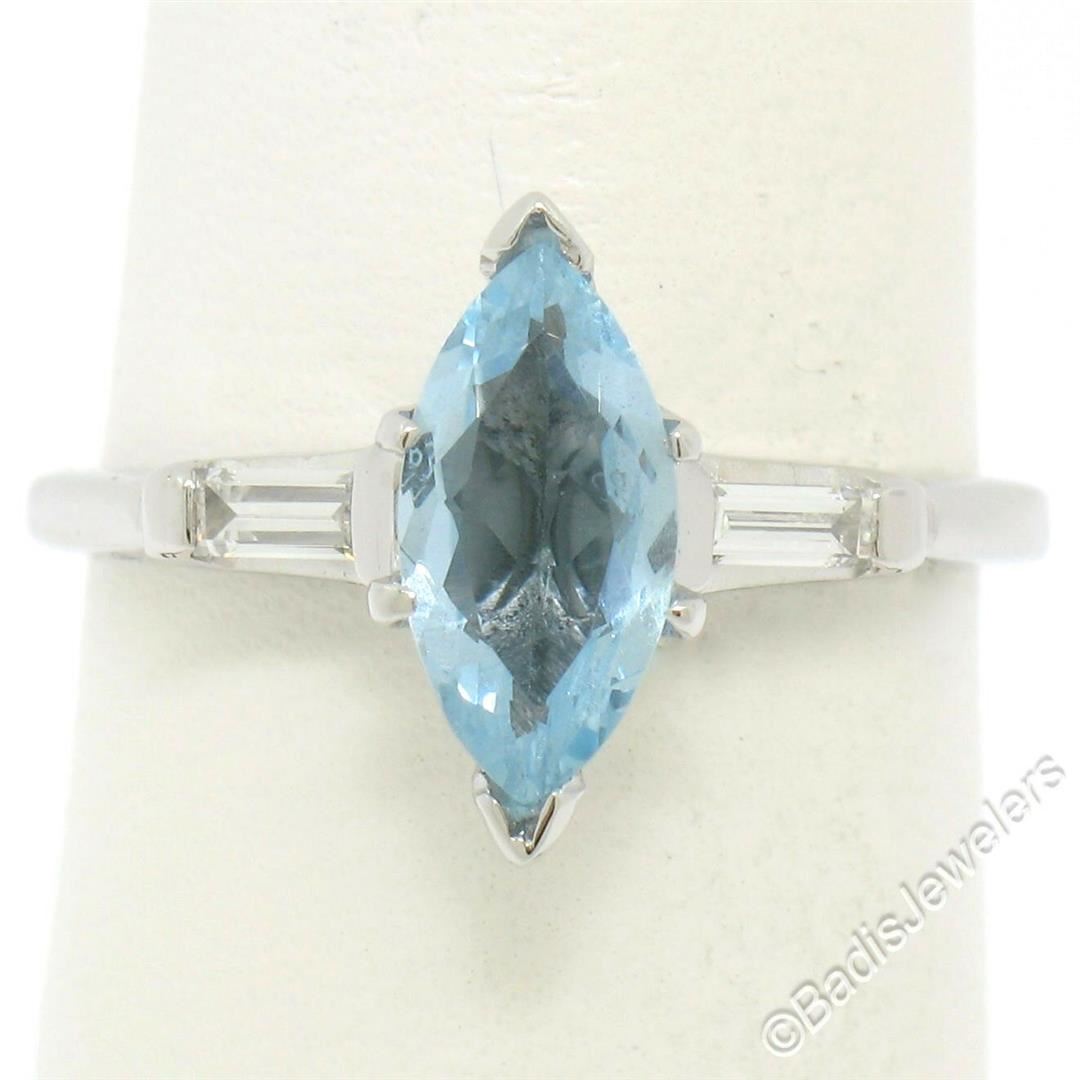 An excellent condition vintage 14kt white gold ring prong set with a 0.85ct marquise cut aquamarine accented with 0.38ctw of baguette cut diamonds (E - VVS2). The ring is size 6.5, weighs a total of 2.56 grams, and measures 12.0mm wide.
