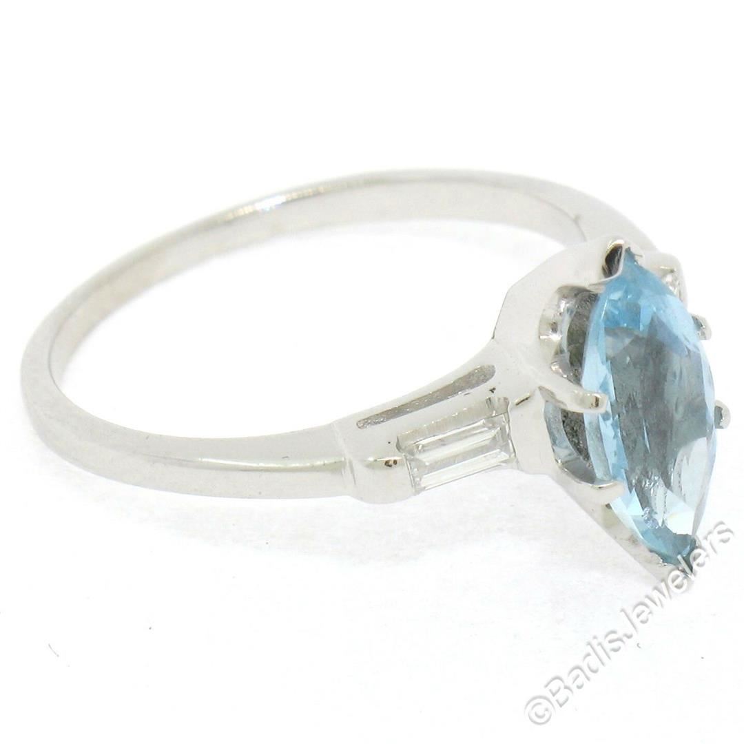 An excellent condition vintage 14kt white gold ring prong set with a 0.85ct marquise cut aquamarine accented with 0.38ctw of baguette cut diamonds (E - VVS2). The ring is size 6.5, weighs a total of 2.56 grams, and measures 12.0mm wide.