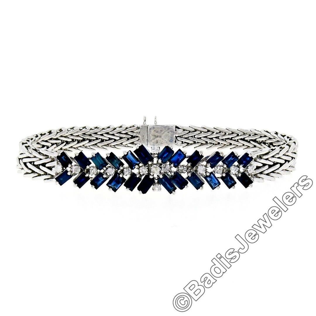 A vintage 14kt white gold chain bracelet featruing a cluster of 3.00ctw of baguette cut sapphires and 0.45ctw of round single cut diamonds (G/H - SI1/SI2). It weighs a total of 24.92 grams, measures 11.8mm wide, and comfortably fits up to a 6.5 inch wrist.