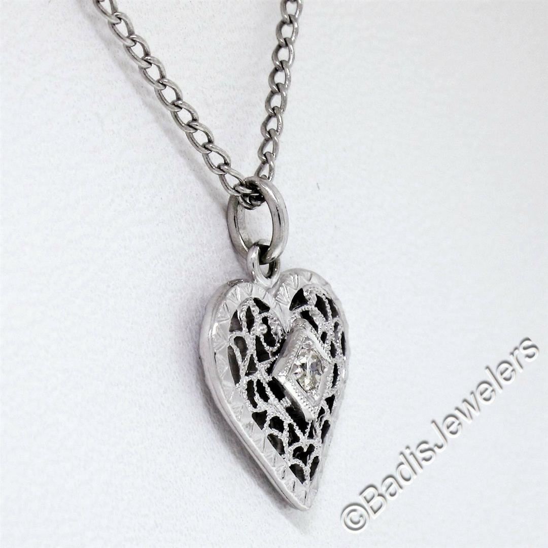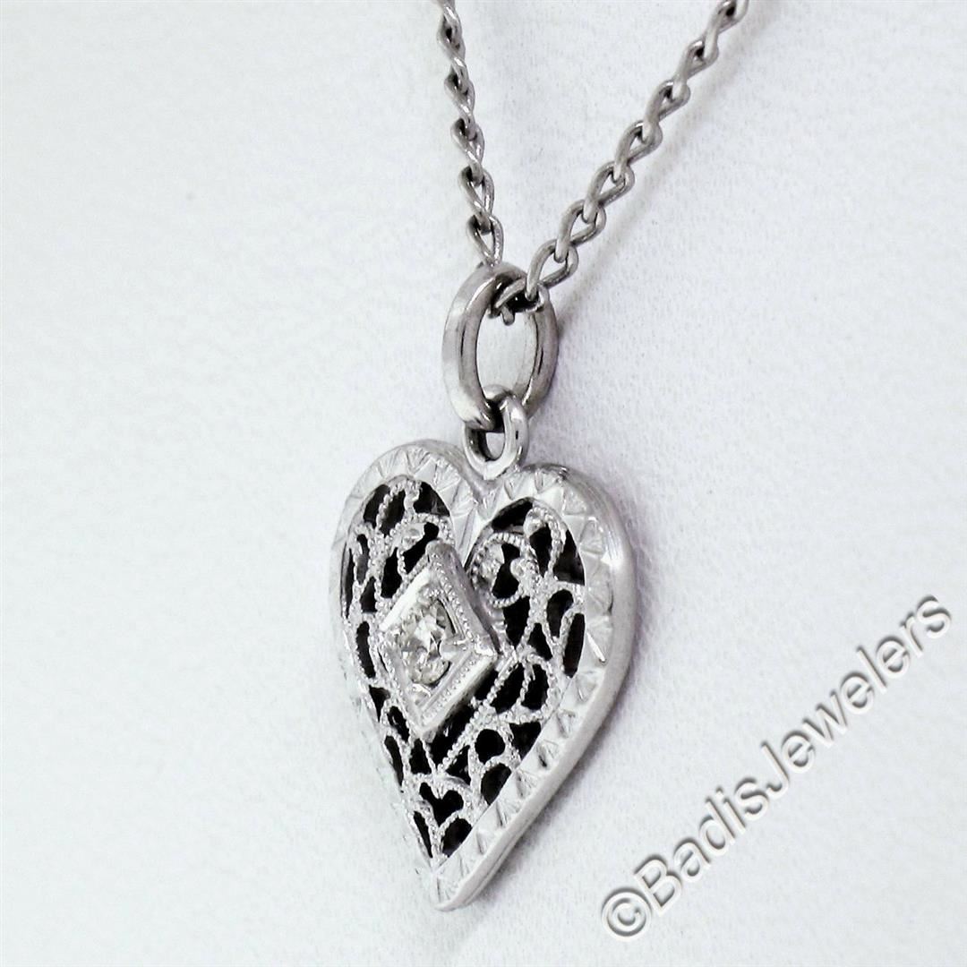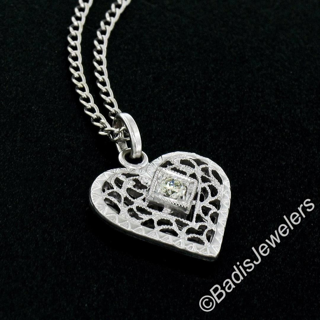 A vintage 14kt white gold open filigree heart pendant necklace with a 6pt round diamond (F - SI1). 17 inch cable link chain, 2.92 grams total weight, measures 17.00x12.75mm.