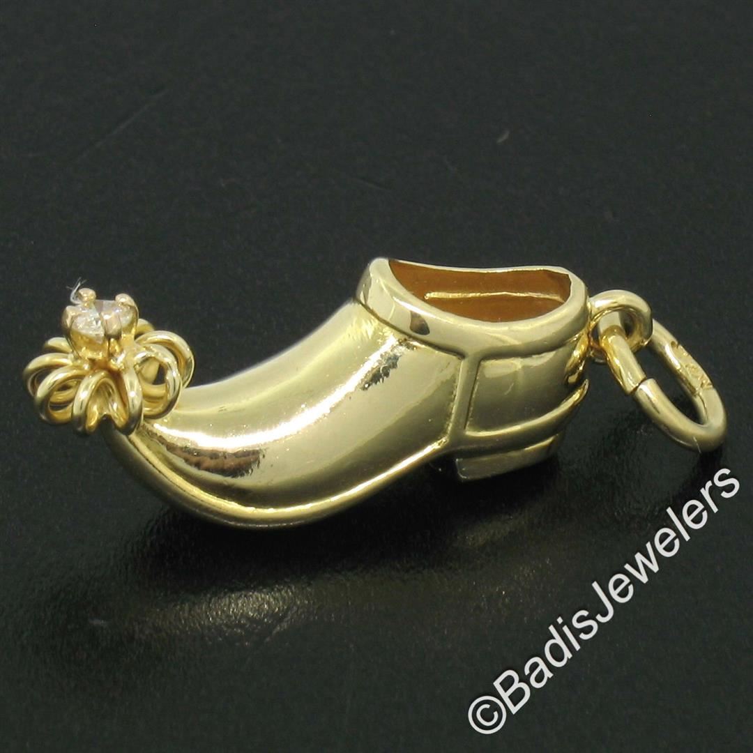 An excellent condition vintage 14kt yellow gold elf shoe charm or pendant with a 0.04ct round diamond (G - VS2). It weighs a total of 1.67 grams, and measures 27.65x22.80mm.