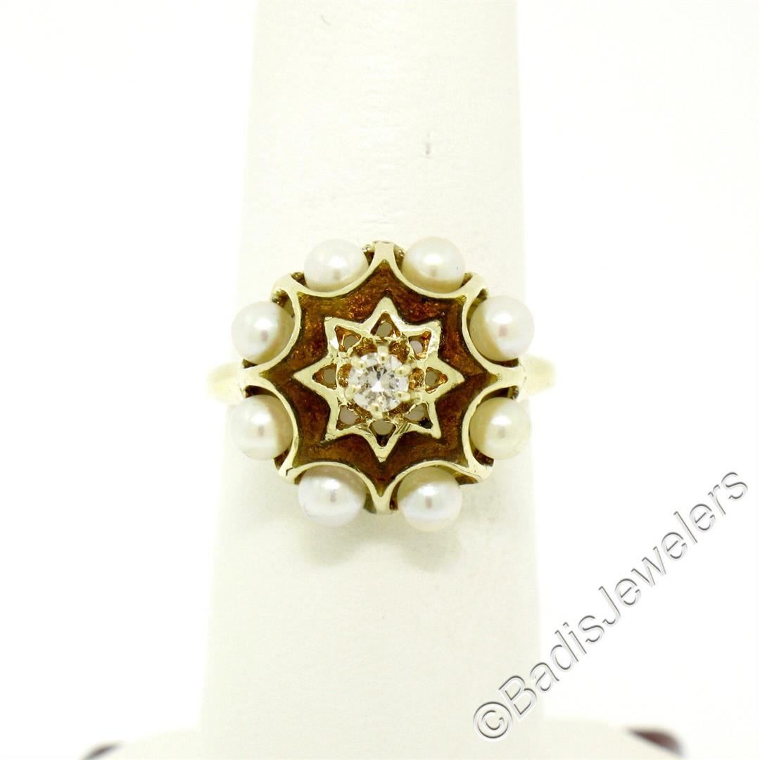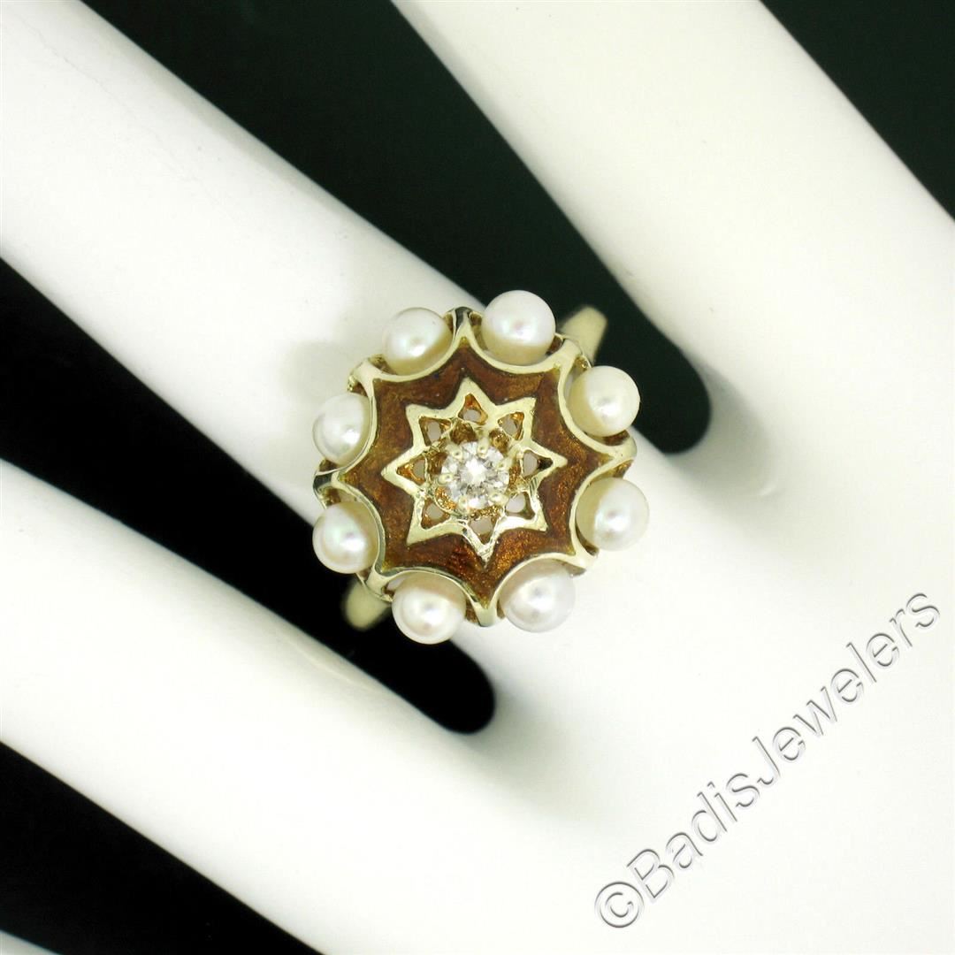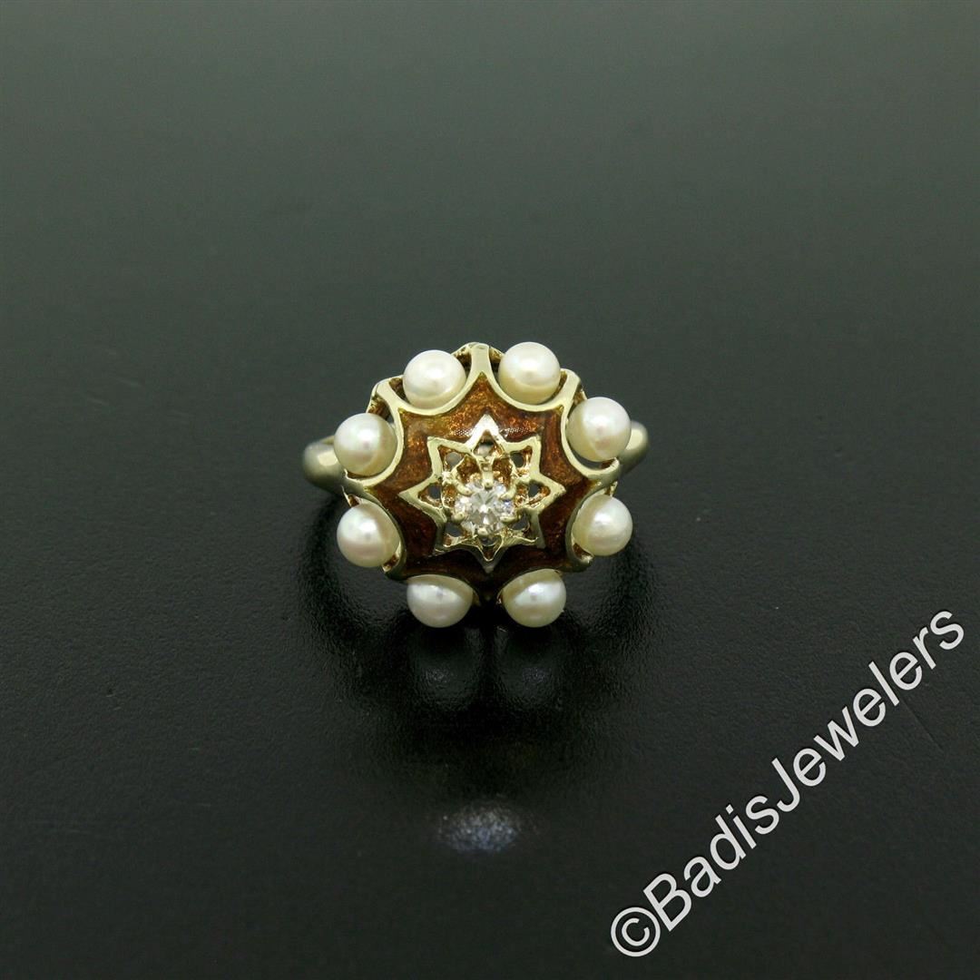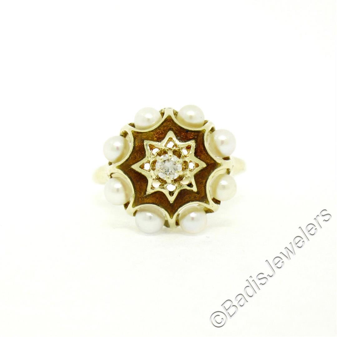 An excellent condition vintage ring set with a 0.11ct round diamond (G - VS2) surrounded by halos of 3.5mm round cultured pearls and brown enamel work. The ring is size 6.5, weighs a total of 4.75 grams, and measures 15.5mm wide.