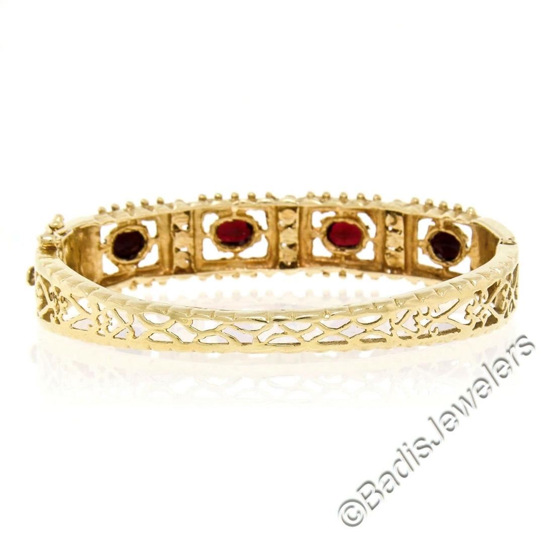 A vintage 14kt yellow gold bangle bracelet with 4.50ctw of oval and round garnets. It weighs a total of 25.08 grams and comfortably fits up to a 6.5 inch wrist.