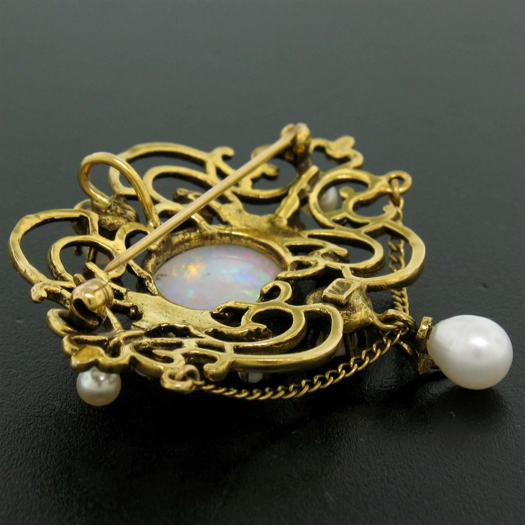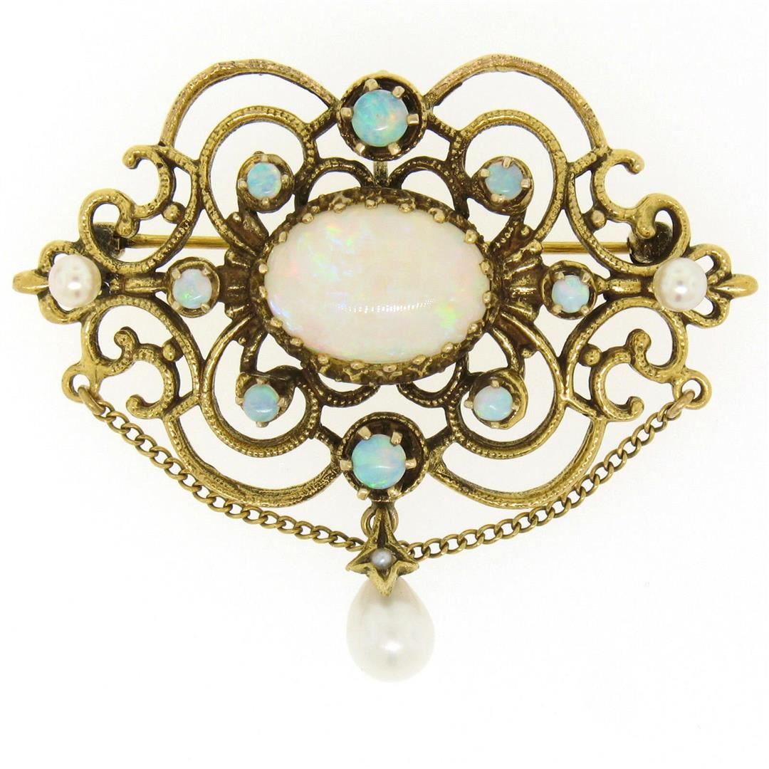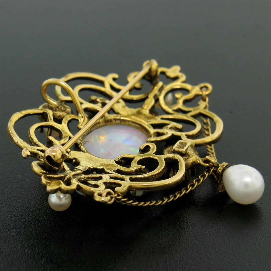 An excellent condition vintage 14kt yellow gold brooch with 4.50ctw of oval and round cabochon cut opals accented by 4 pearls. Measures 40.3x47.8mm and weighs a total of 11.3 grams.
