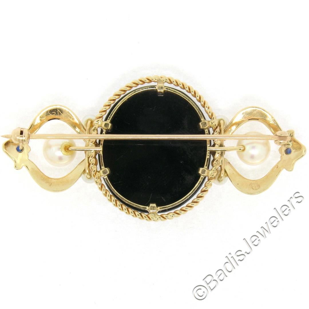 A vintage 14kt yellow gold brooch with a 22.75x20.20mm black onyx floral mosaic accented by 0.18ctw of round sapphires and and both 6.15mm and 3.20mm pearls. Measures 53.60x26.05mm and weighs a total of 9.24 grams.