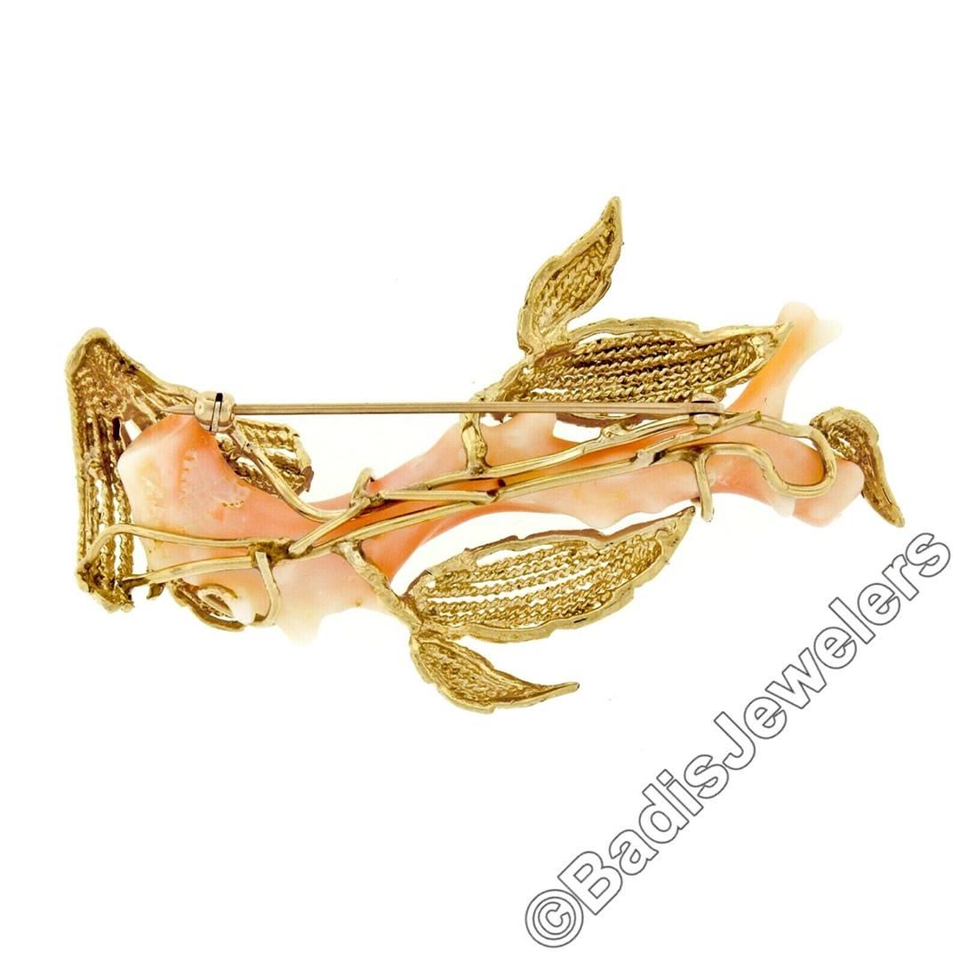 A vintage 14kt yellow gold brooch featuring a piece of natural angel skin coral and twisted wire work. Measures 67.0x40.8mm and weighs a total of 17.22 grams.