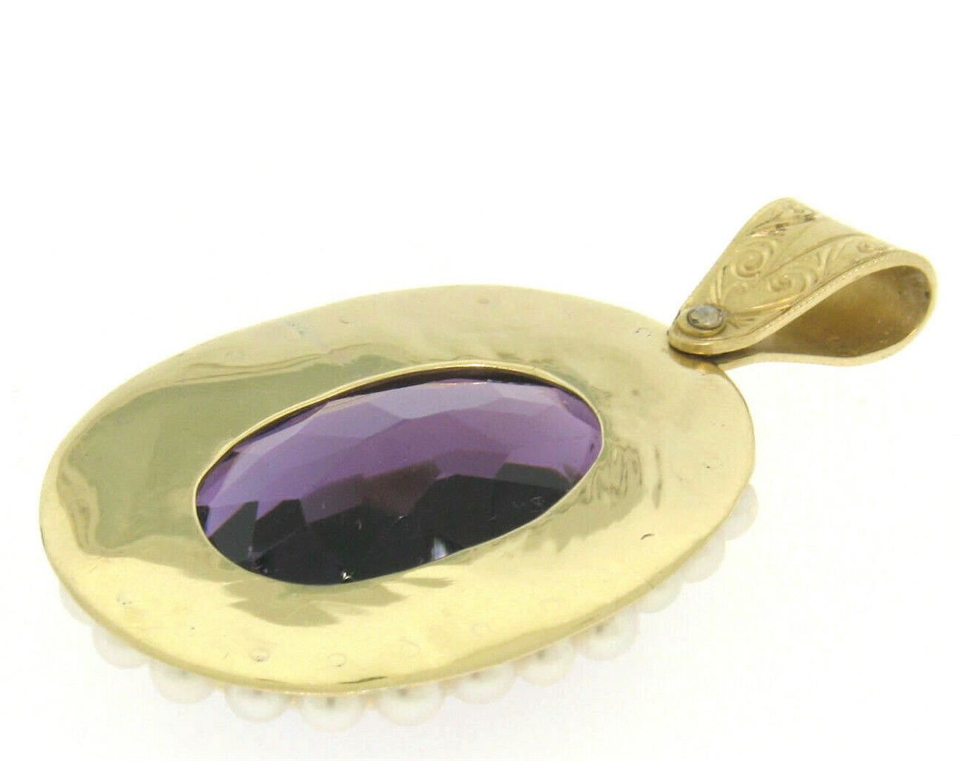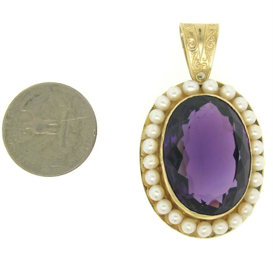 A vintage 14kt yellow gold pendant featuring a large 28.0ct oval amethyst surrounded by a halo of 3.8mm cultured pearls. The pendant weighs a total of 22.0 grams, measures 53.34x31.75mm including the bail, and the inside of the bail measures 5.0mm in diam