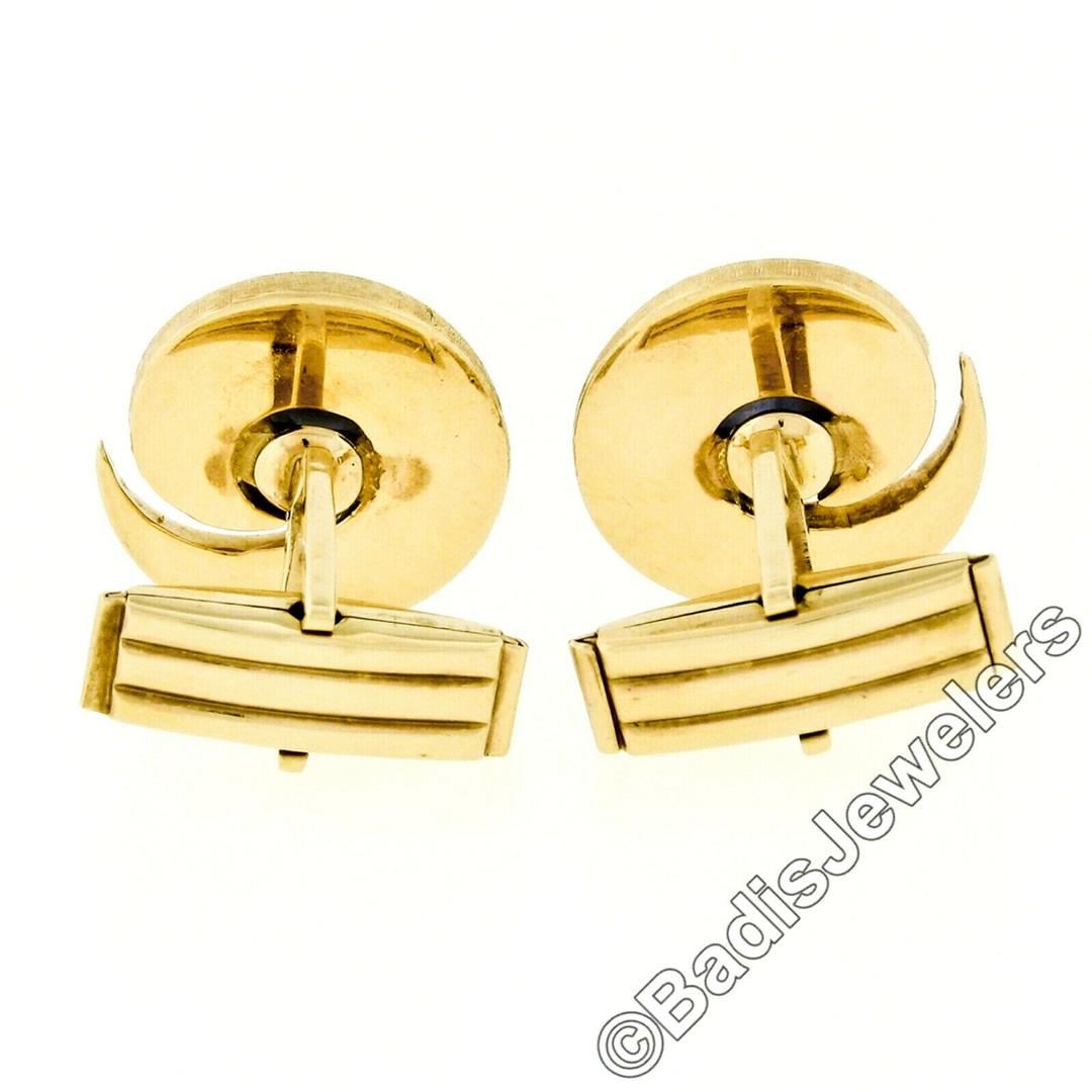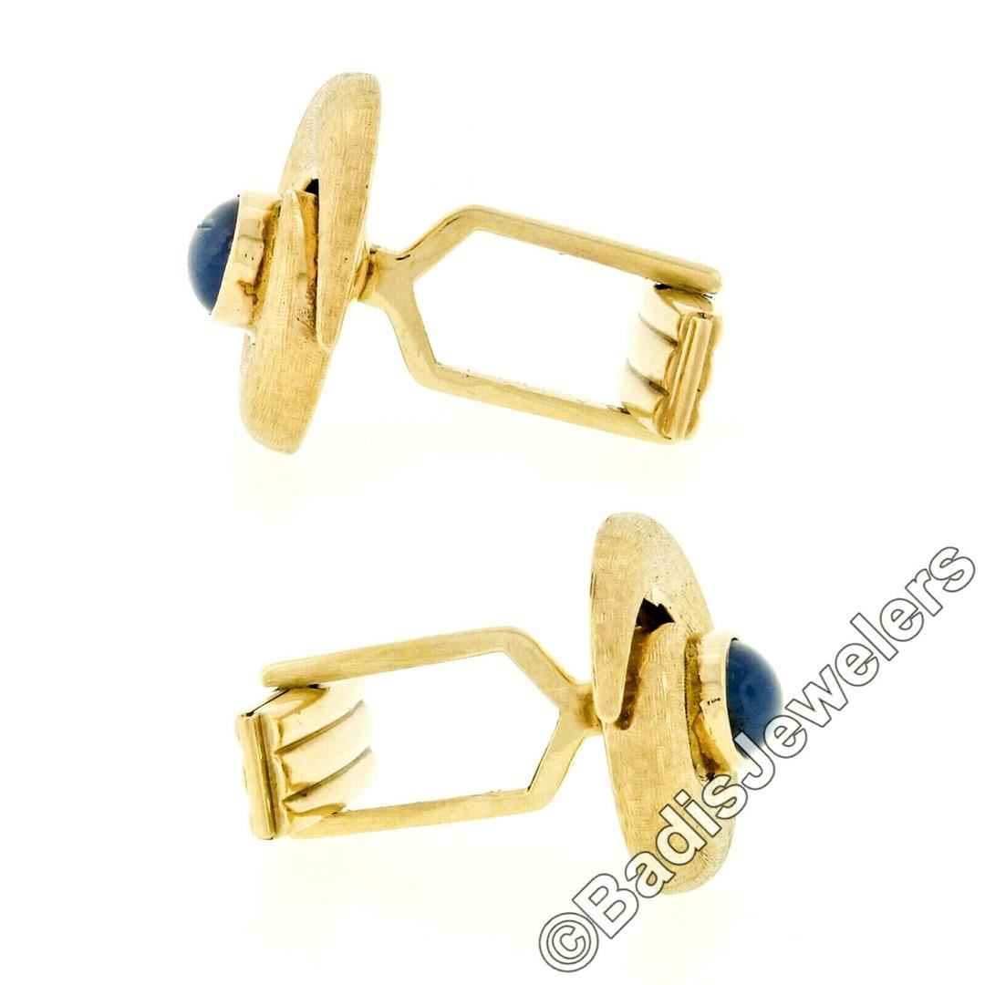 Vintage 14kt yellow gold swirl pattern cuff links bezel set with 2 oval natural blue star sapphires (2.90ctw). These cuff links have a swivel back design with a clearence of 10.0mm, weigh a total of 21.45 grams, and the front panels measure 18.00x18.15mm.