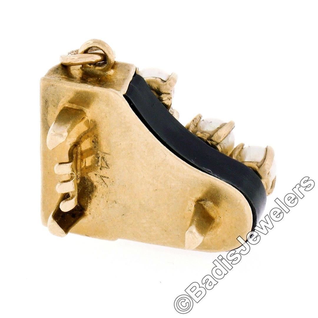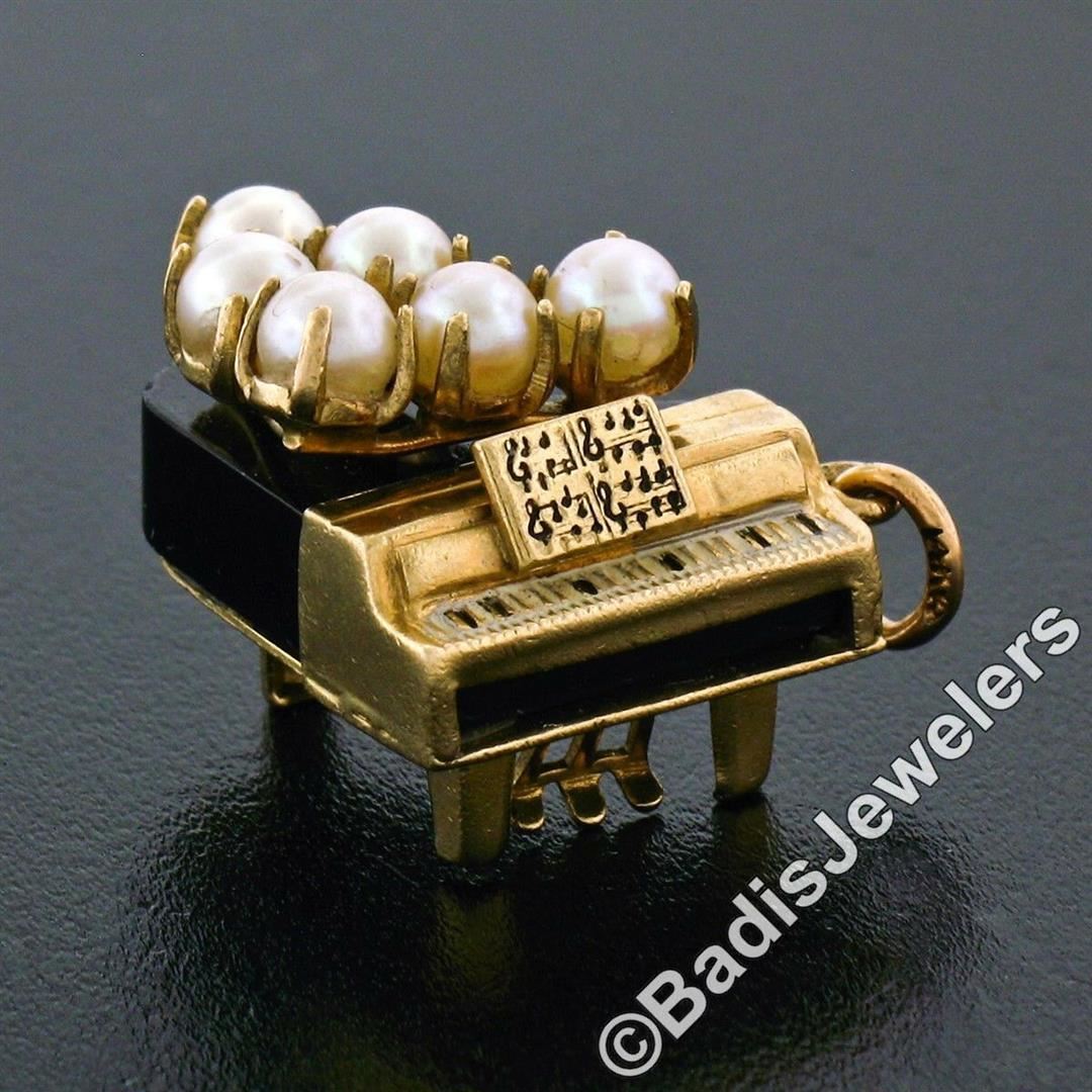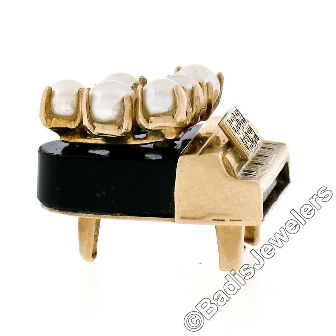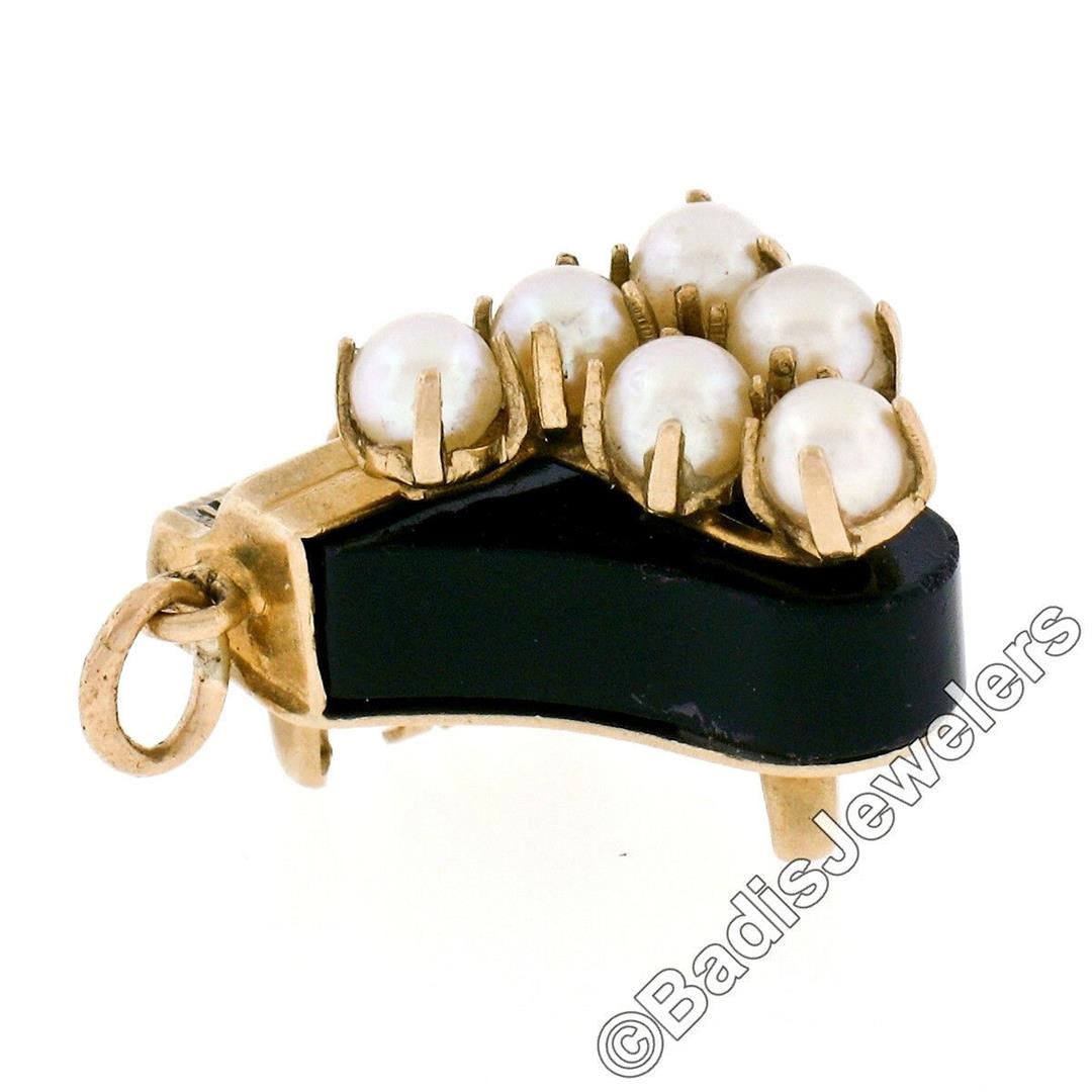 A vintage 14kt yellow gold piano charm or pendant with a custom cut piece of black onyx and 6 individually prong set 3.5mm round cultured pearls. The pendant weighs a total of 3.4 grams, measures 16.85x19.40x13.50mm including the bail, and the inside of the bail measures 2.85mm.