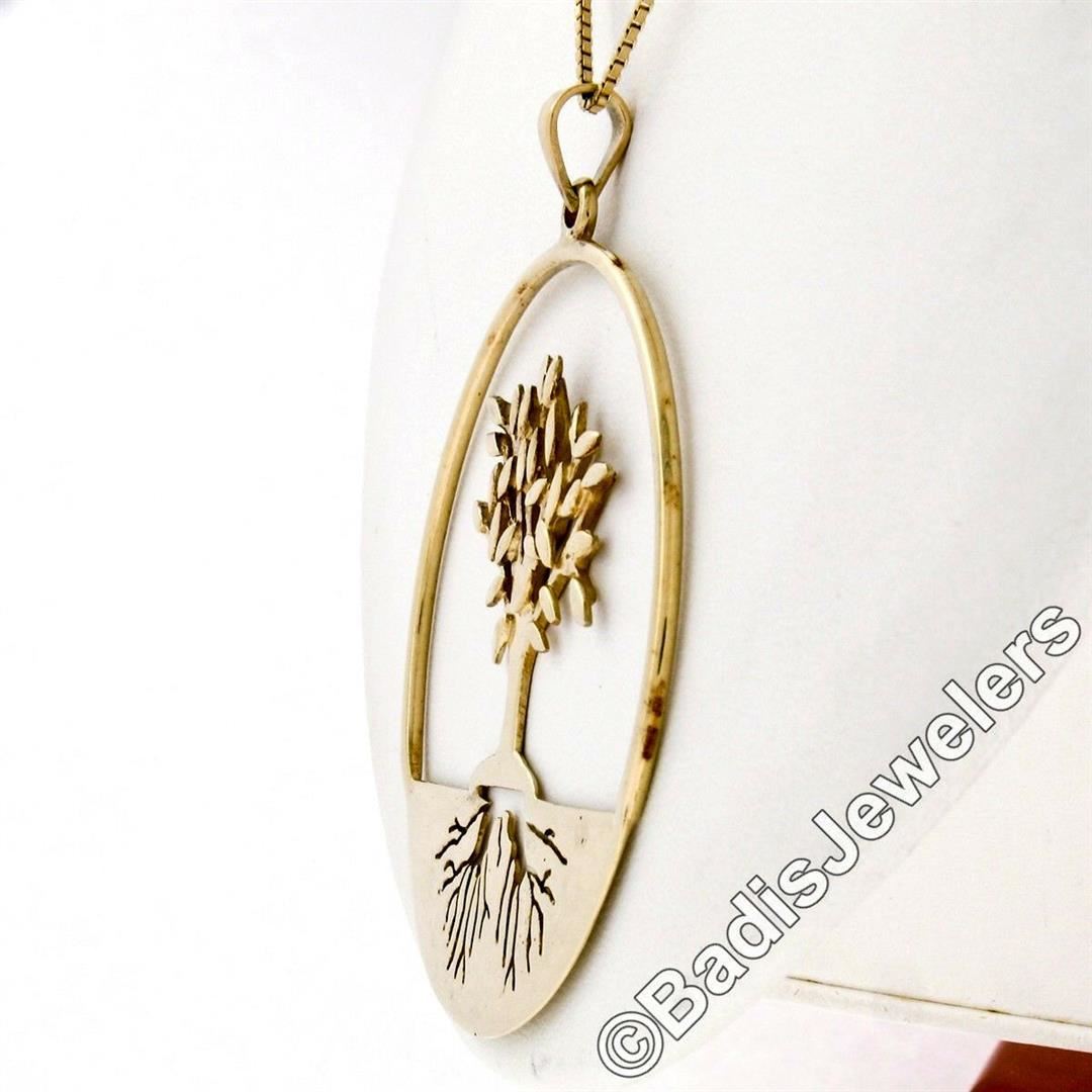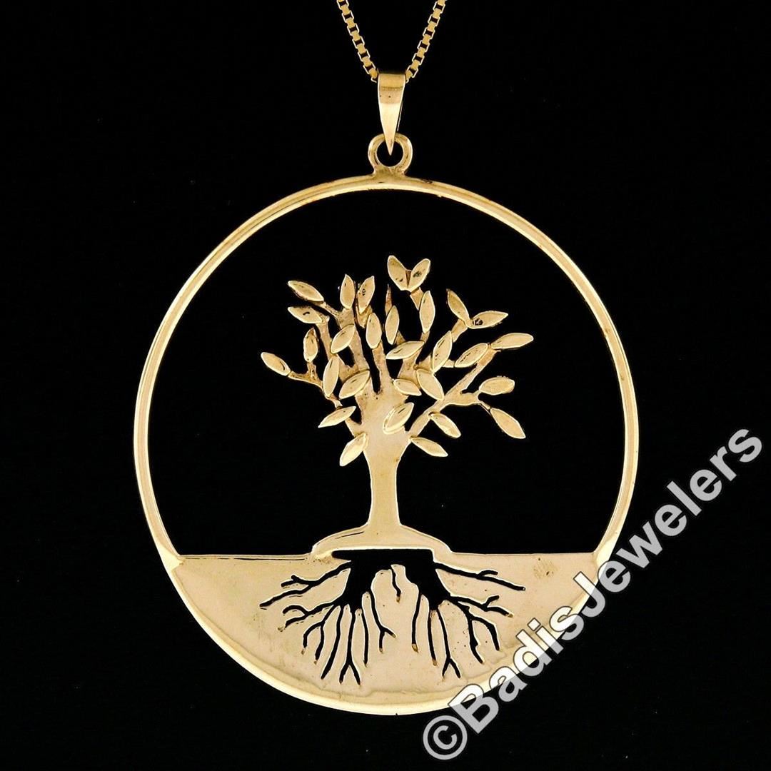 A large vintage 14kt yellow gold pendant necklace with a textured "Tree of Life" motif. Comes with a 24 inch box link chain, 12.2 grams total weight, pendant measures 59.00x46.45mm with the bail.