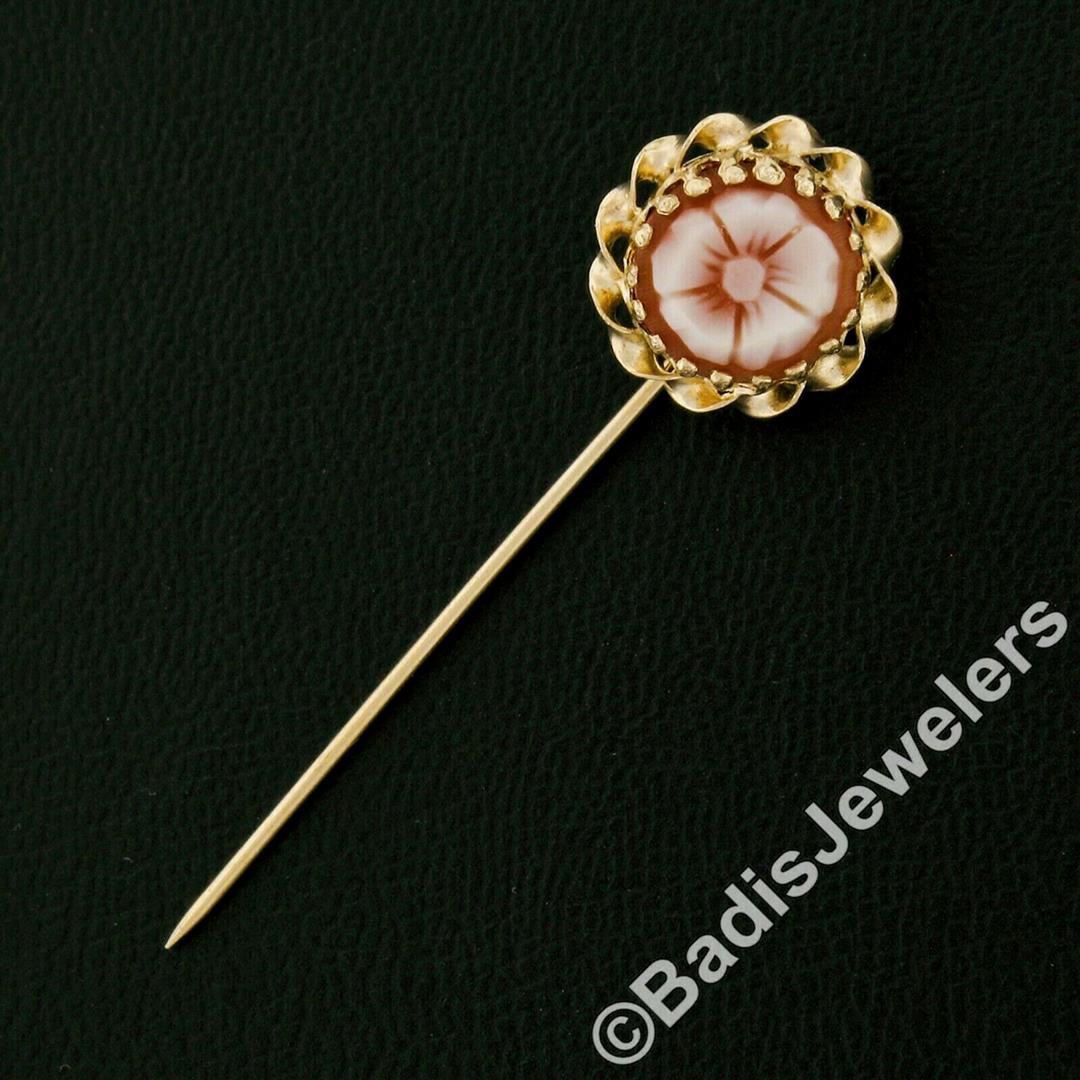 A vintage 14kt yellow gold stick pin featuring a 10mm round carved shell flower cameo surrounded by a twisted wire frame. Measures 48.30x13.85mm and weighs a total of 1.77 grams.