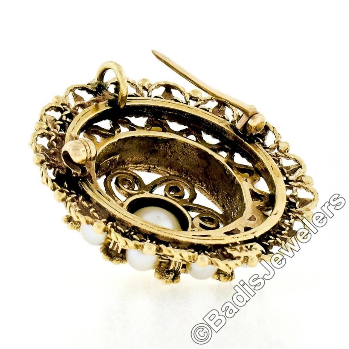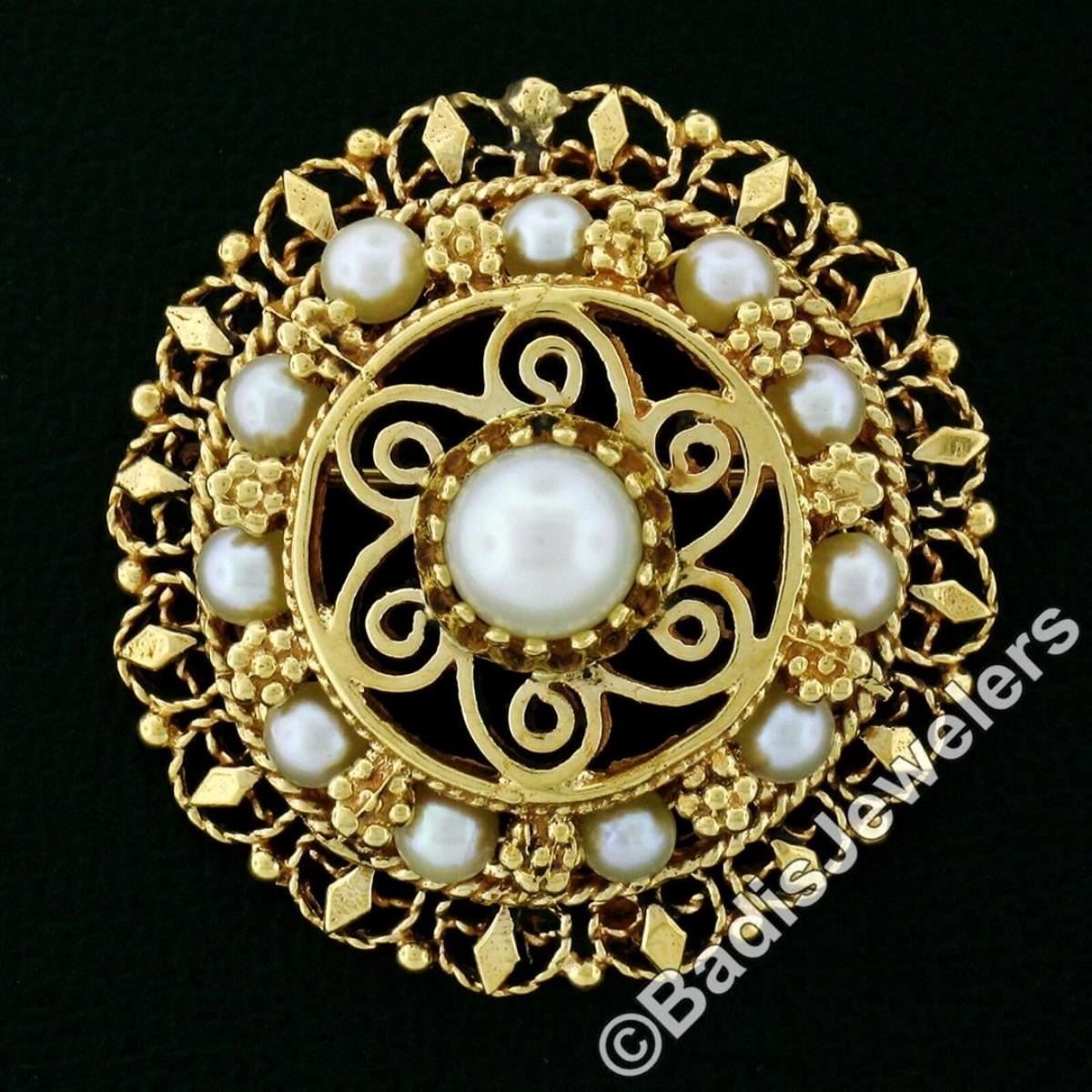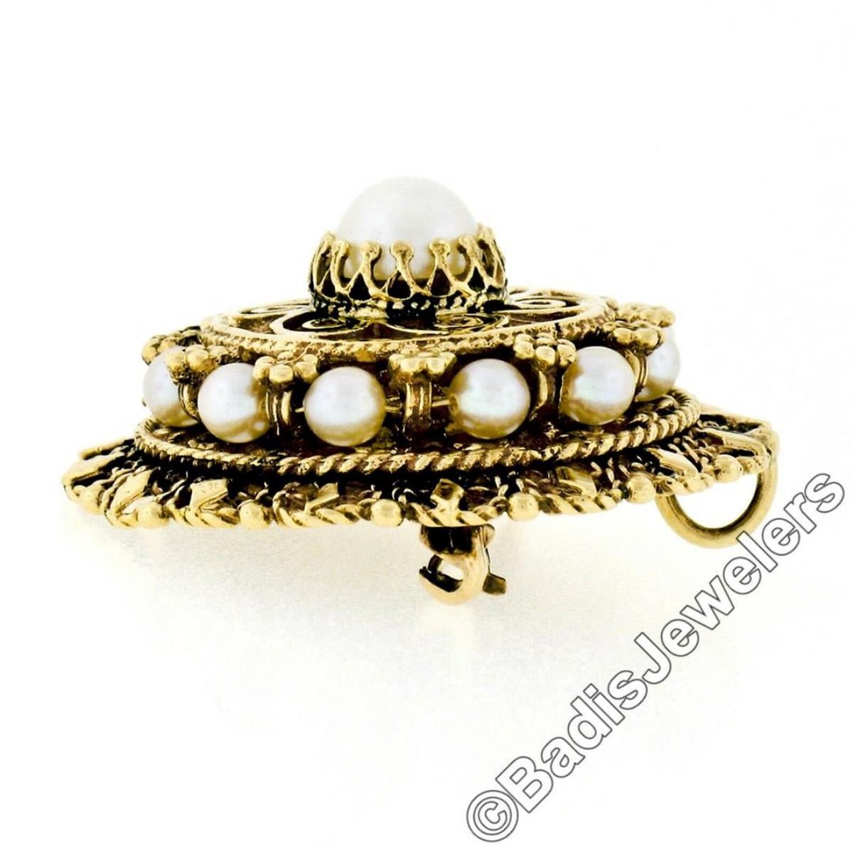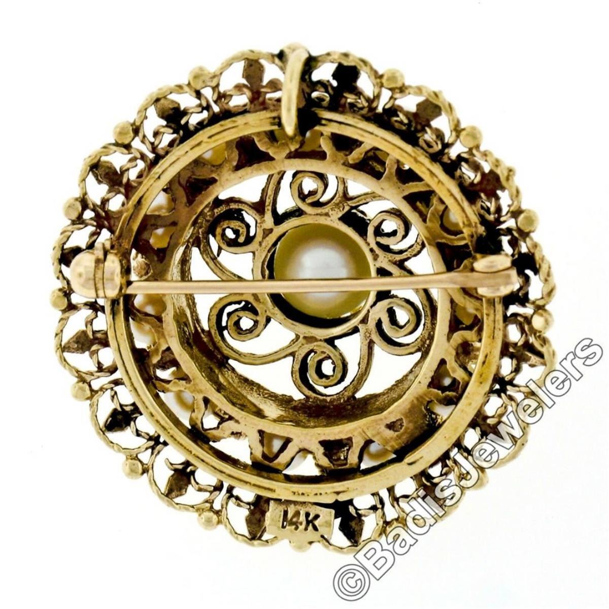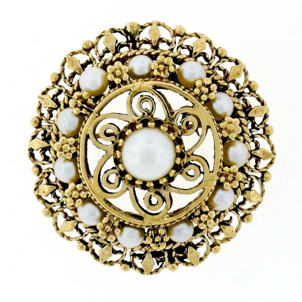 A vintage 14kt yellow gold pendant or brooch featuring 12 round white cultured pearls (6mm center / 3.35mm outer ring). The pendant weighs a total of 10.62 grams, measures 30.1mm in diameter, and the inside of the bail measures 2.7x3.5mm.