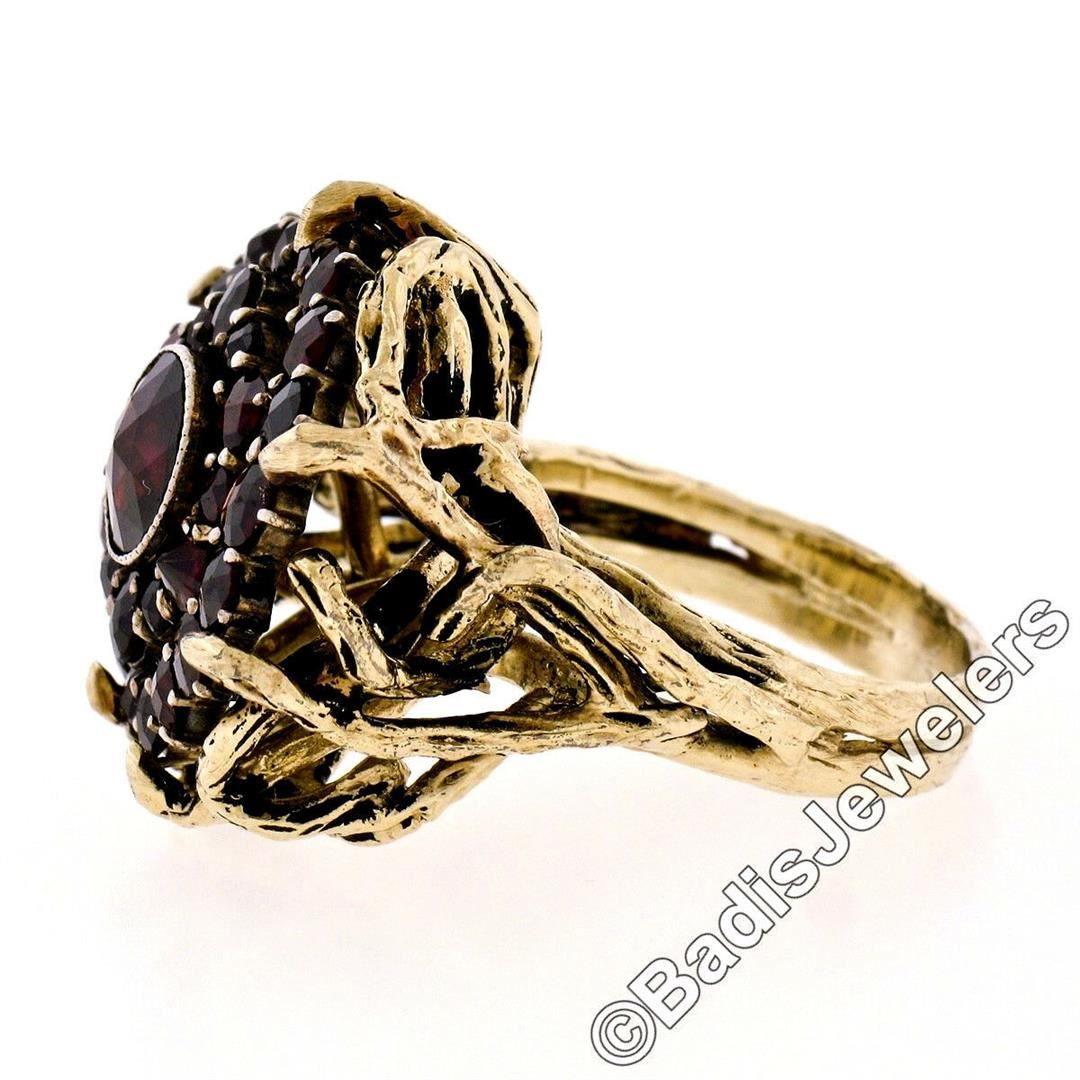 A vintage 14kt yellow gold cluster ring featuring a 7.4mm round garnet set at its center in a sterling silver-topped bezel among 30 additional round cut garnets. The ring is size 7.5, weighs a total of 16.18 grams, and measures 23.85mm wide.