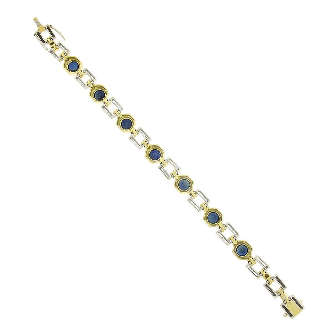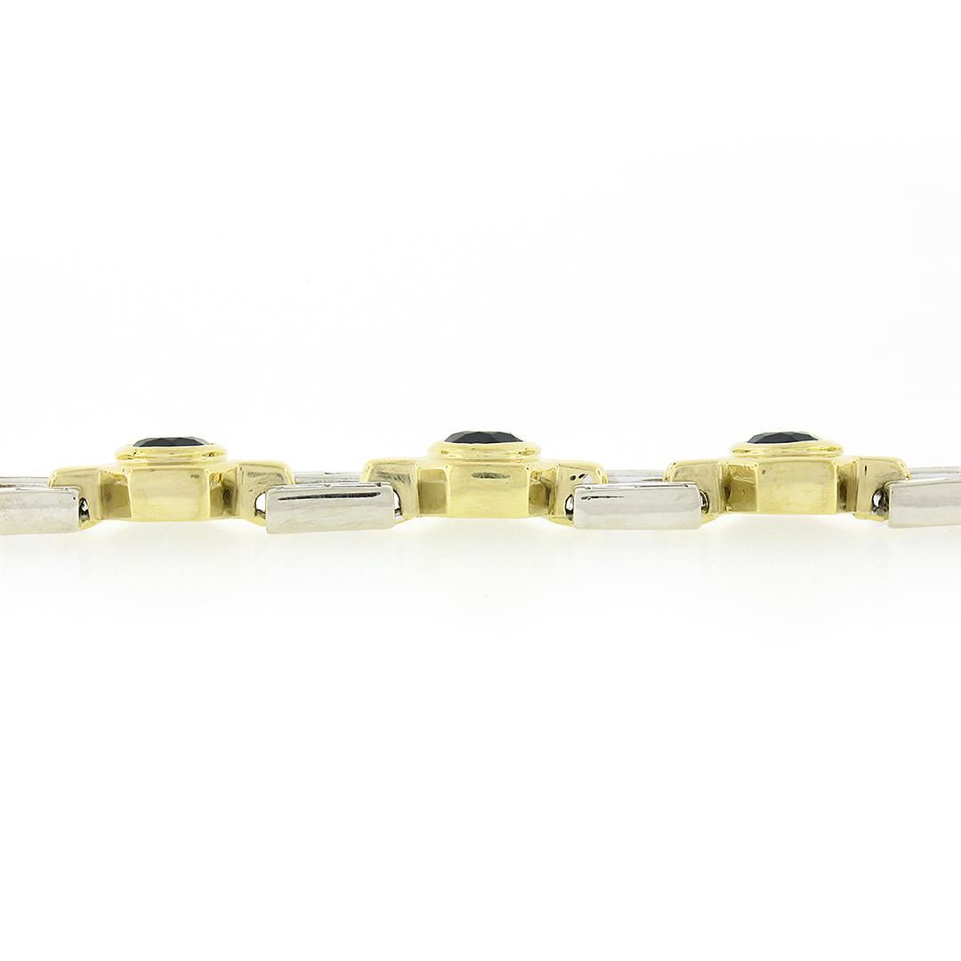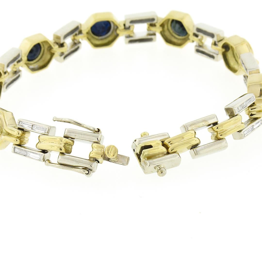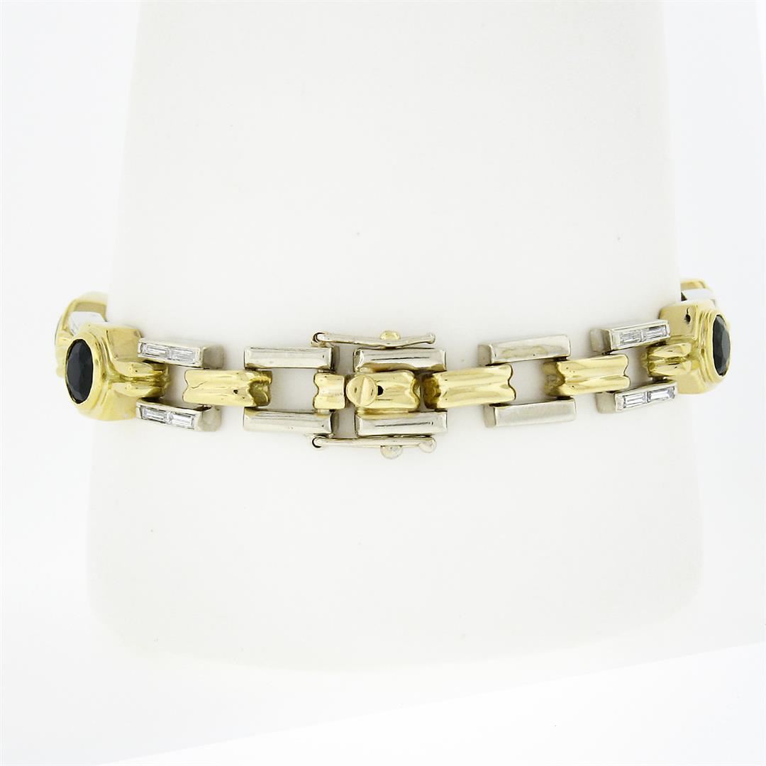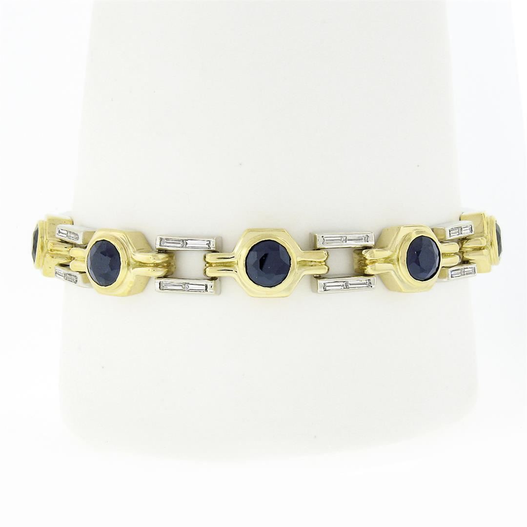 A solid 18k and 14k yellow & White gold link bracelet, with 7 round brilliant cut natural sapphires (6.2mm - 8.75ctw), and 32 straight baguette cut natural diamonds (G/H - VS1/VS2 ; 1.60ctw). It weighs a total of 36.15 grams, measures 9.20mm wide, and m