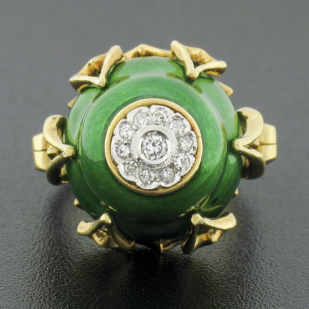 Vintage 18K Gold 0.15 ctw Diamond Cluster Green Enamel Large Prong Domed Tall Ri