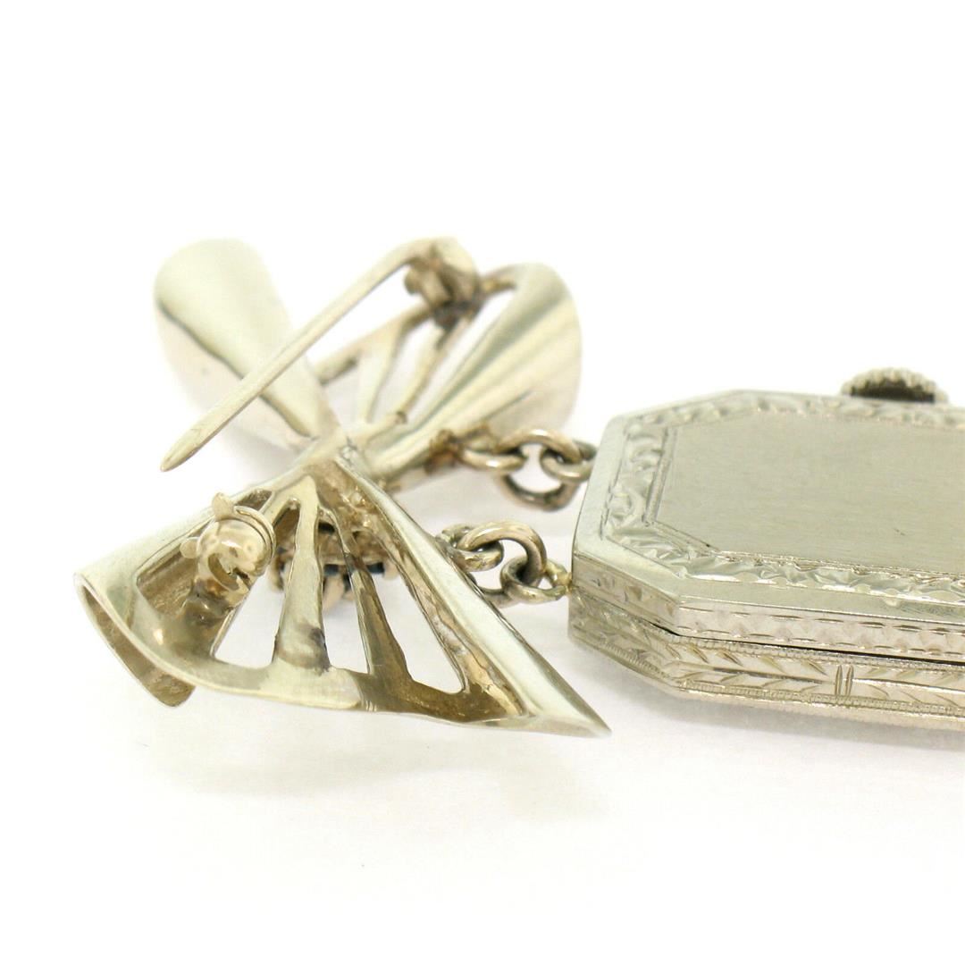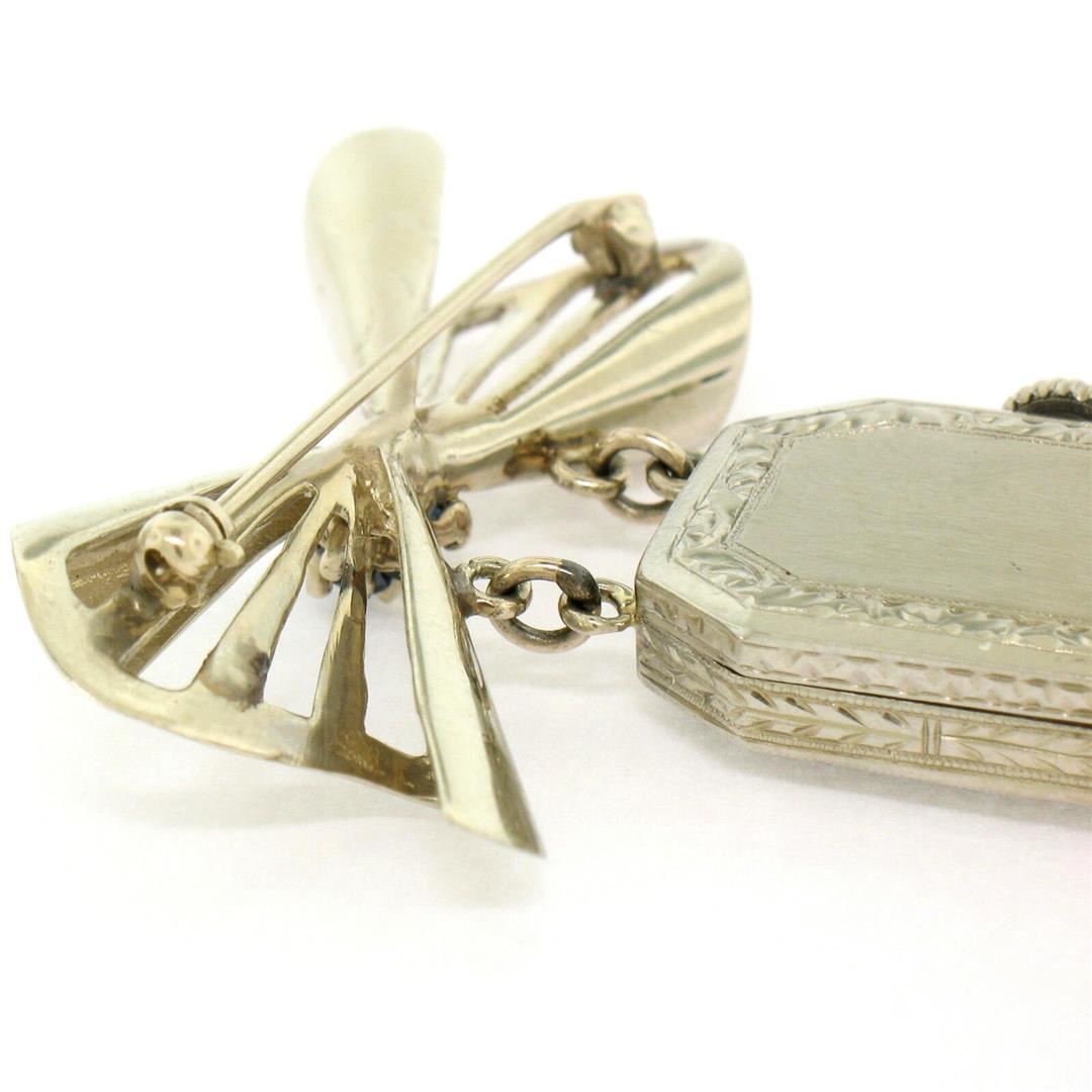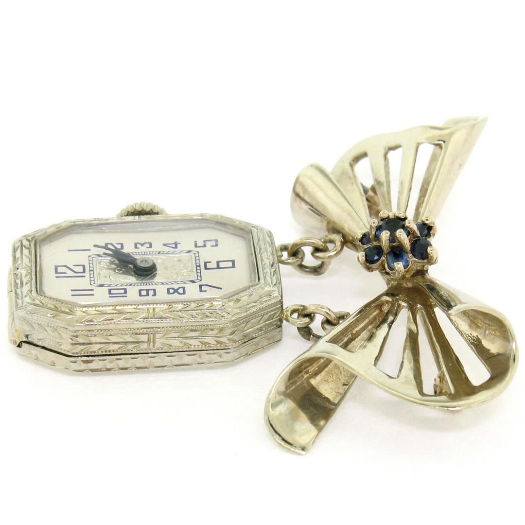 One Vintage 18K Gold 12pt Sapphire 15 Jewels Untermeyer Robbins Watch Bow Pin Brooch. Item Details: Material (Watch Case): Solid 18K White Gold, Material (Pin): Solid 14K White Gold, Total Weight: 15.6 Grams, Stones: (7) Natural Genuine Sapphires - Round Cut - Prong Set - Royal Blue Color - 0.12ctw (approx.), Movement: Swiss Made - Mechanical - Hand Winding - 15 Jewels - Adjusted for 2 Positions, Overall Height: 40.60mm, Overall Width: 39.40mm (pin), 19.73mm (watch), Overall Thickness: 6.78mm Clasp: Pin Back w/ Rotating Lock Condition: Vintage piece. Excellent physical and running condition!