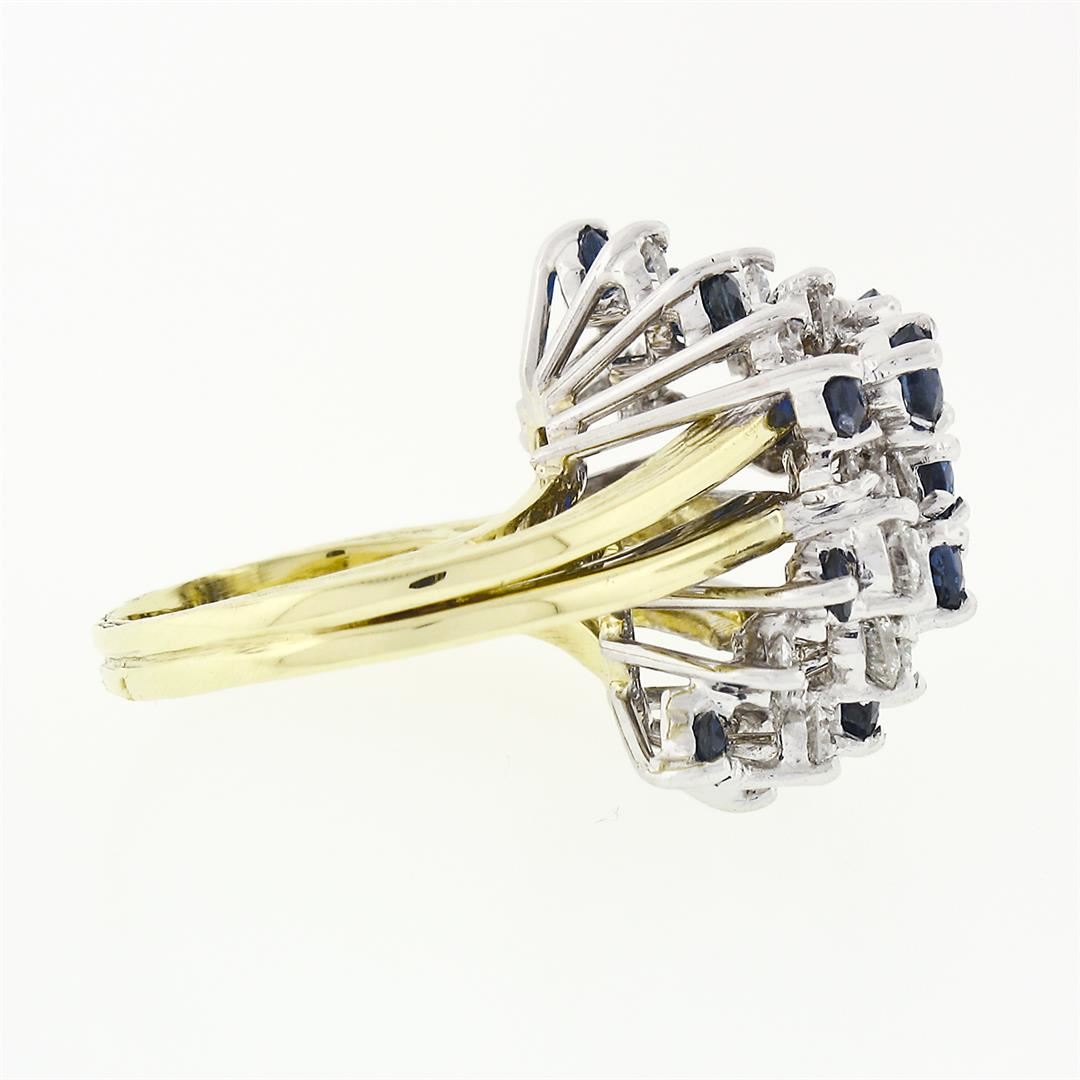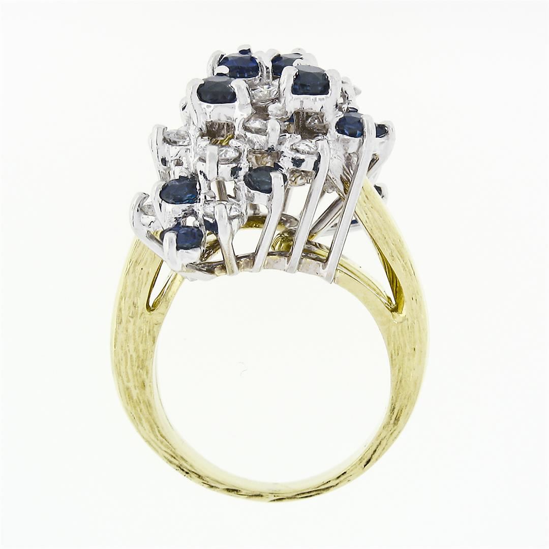 A vintage solid 18k yellow & white gold tiered cluster ring, with 18 round brilliant cut natural diamonds (F/G - VS1/VS2; 1.20ctw), and 14 round brilliant cut natural sapphires (1.0ctw ). The ring is size 3.5, weighs a total of 9.91 grams, and measures 16mm wide.