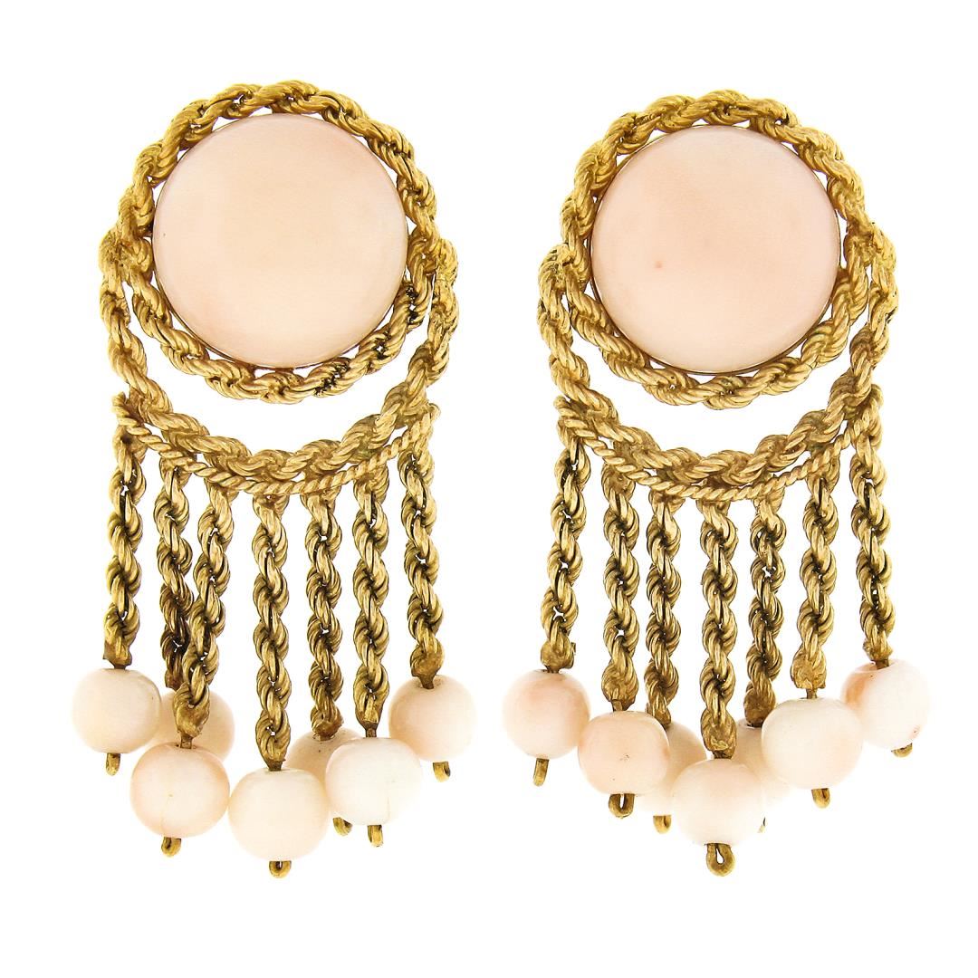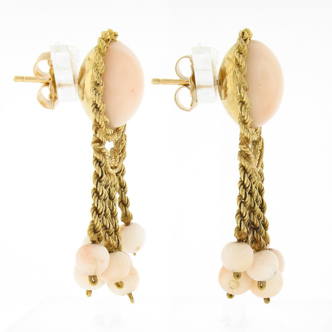 A vintage solid 18k yellow gold dangle earrings, with 2 button shape natural corals (14.5mm each), and 14 round bead shape natural corals ( 5.4mm to 5.9mm each). The earrings measure approximately 45.60x20.60mm and weigh a total of 22.49 grams.