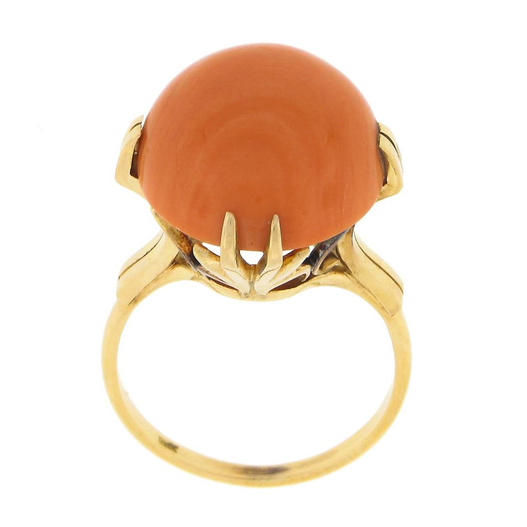A vintage solid 18k yellow gold ring, with 1 oval cabochon cut natural coral (16.2x13.9mm). The ring is size 5.0, weighs a total of 5.52 grams, and measures 18.1mm wide.