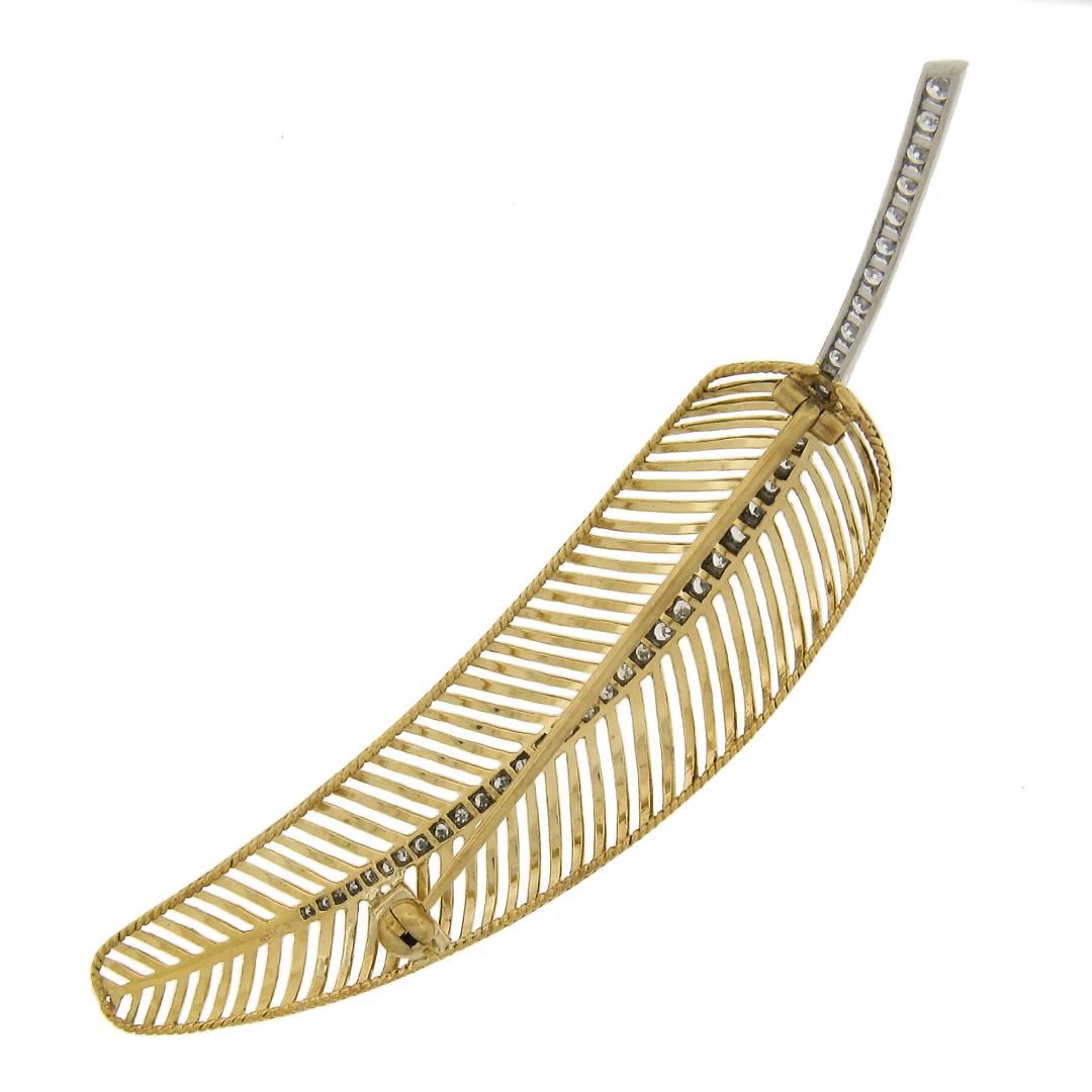 Vintage 18K Gold & Platinum 1ctw Diamond Polished Long Feather Leaf Brooch Pin