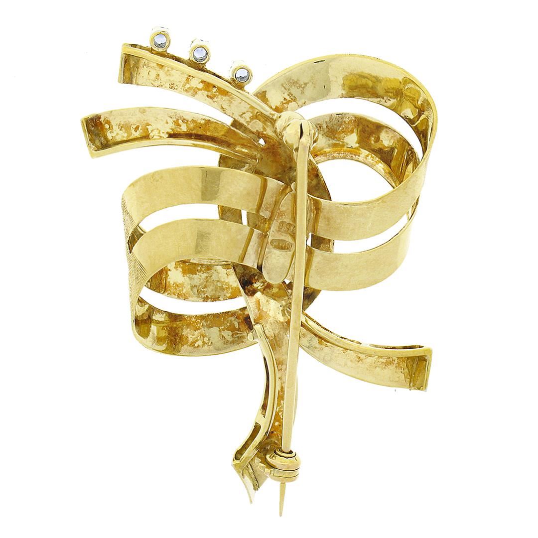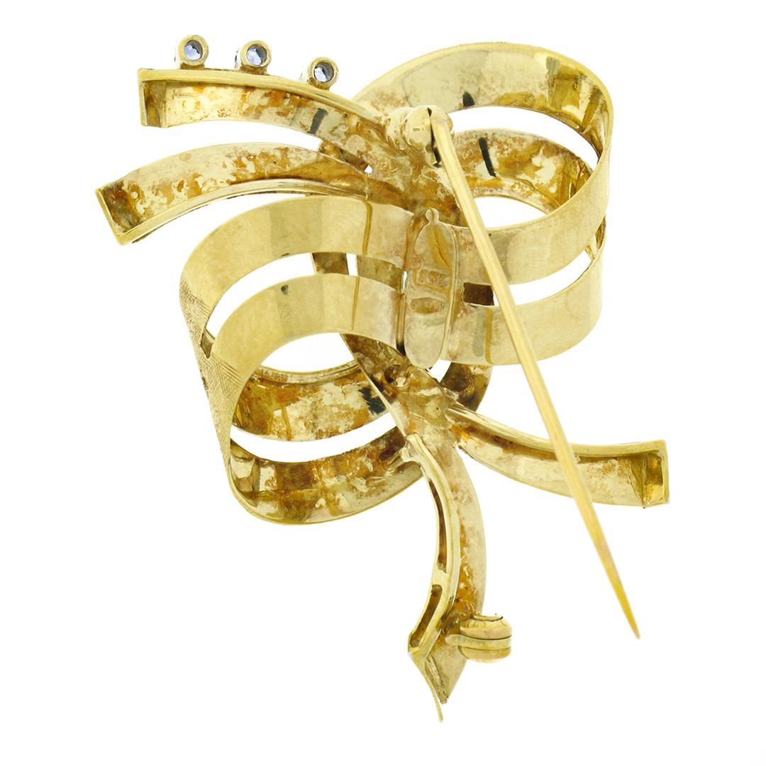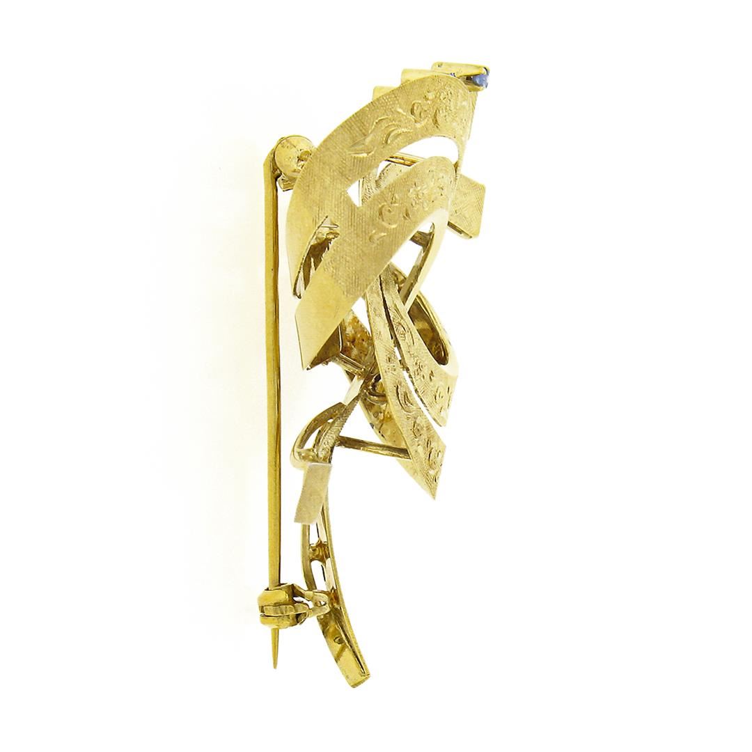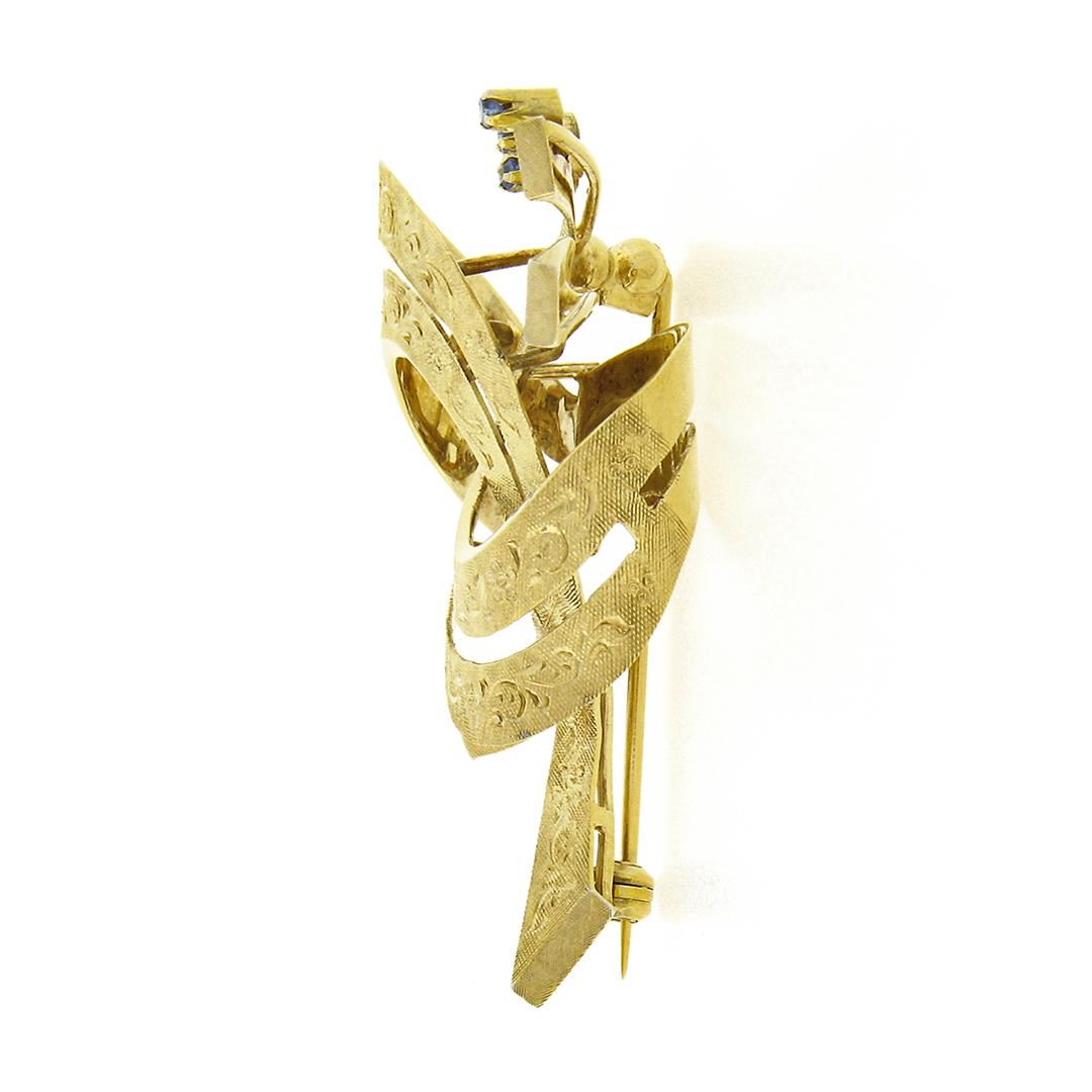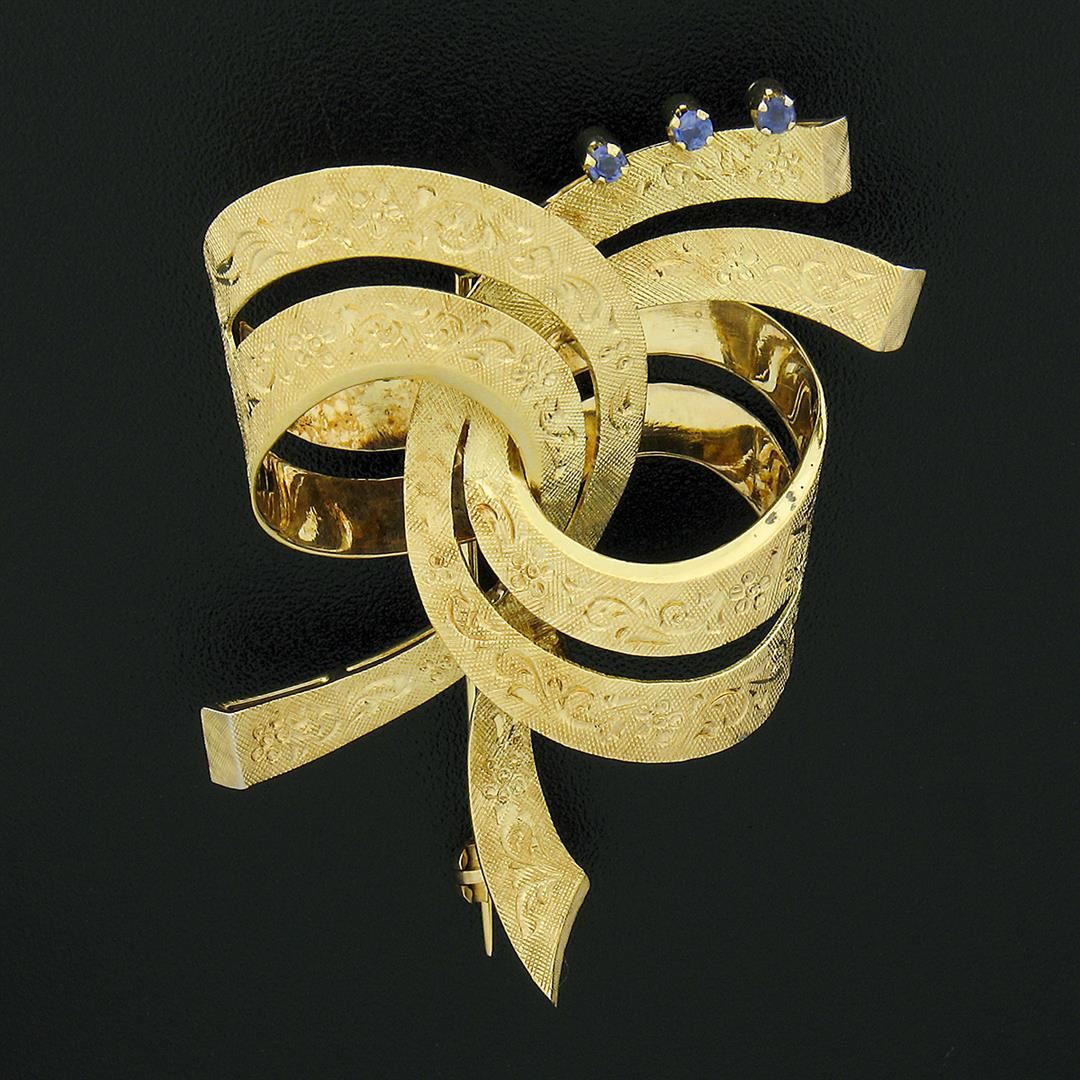 A solid 18k yellow gold ribbon pin brooch, with 3 round cut natural sapphires (0.05ctw). Measures 34.30x45.25mm and weighs a total of 8.50 grams.