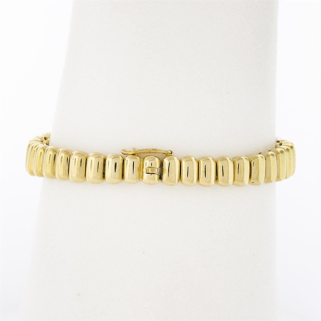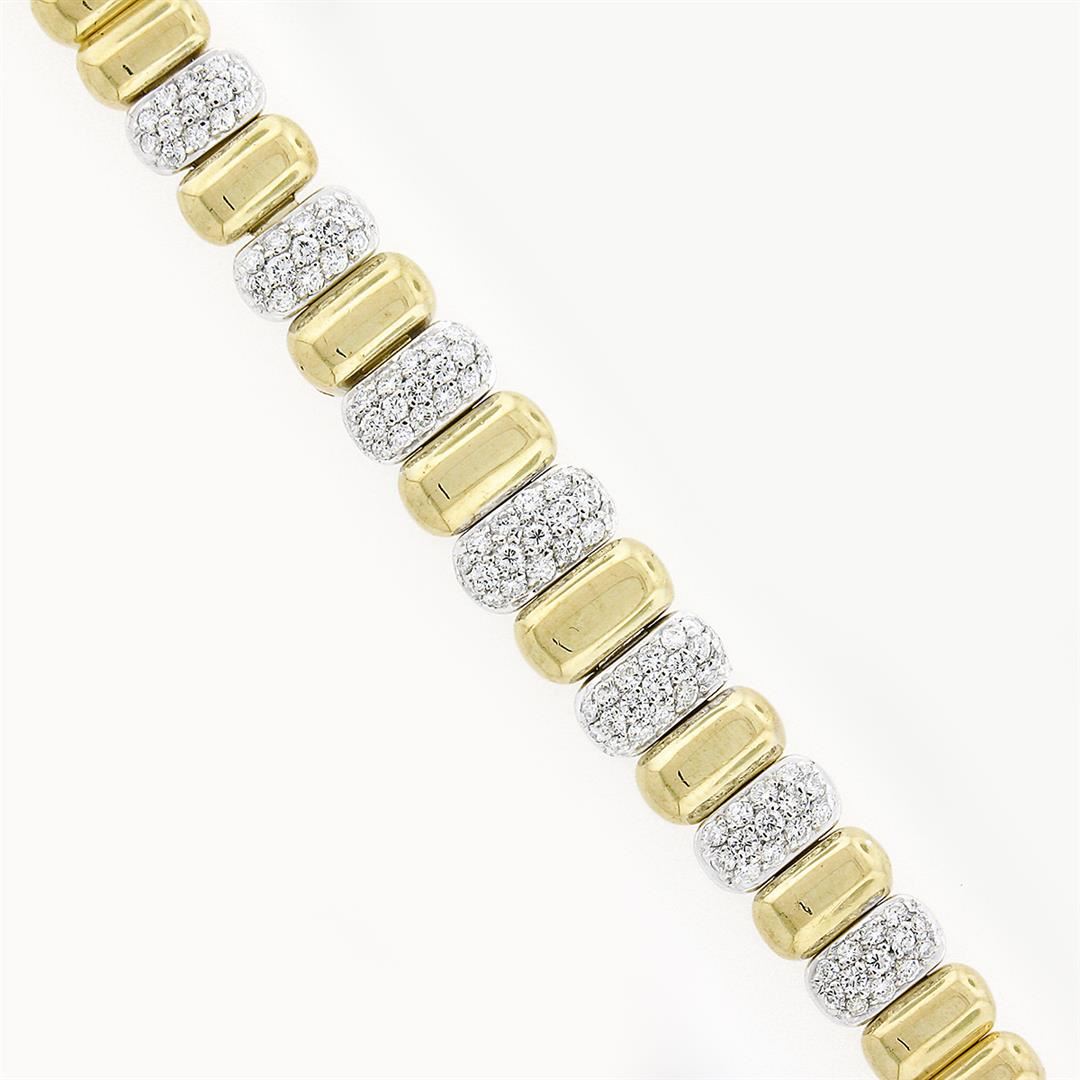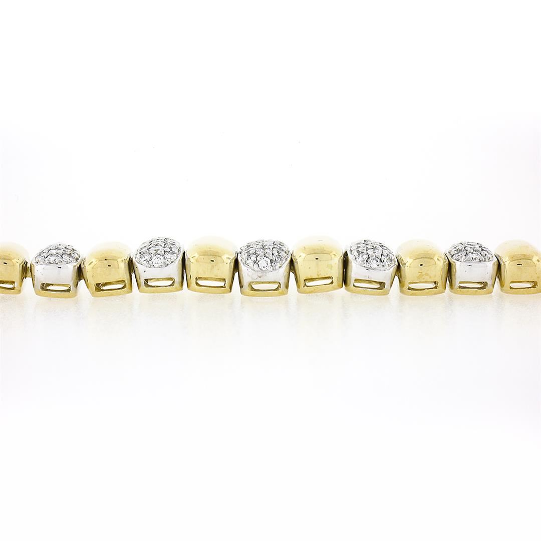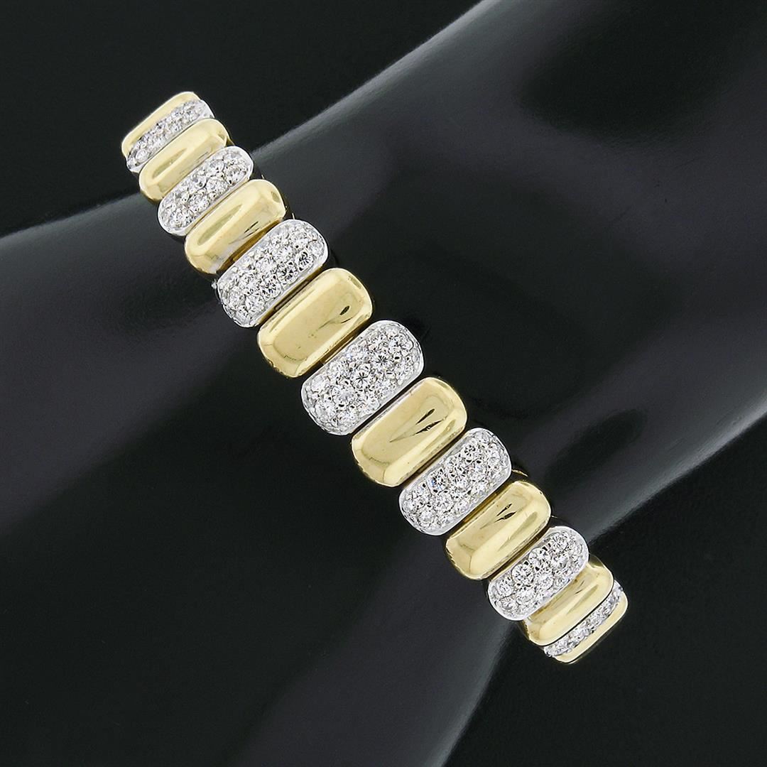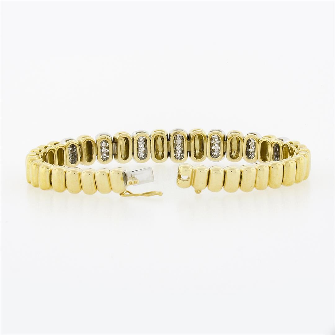 A vintage solid 18k yellow and white gold oval link bracelet, with 109 round brilliant cut natural diamonds ( F/G - VS1/VS2 ; 1.50ctw). It weighs a total of 44.05 grams, measures 10.30mm wide, and measures 6.25 inches in length.