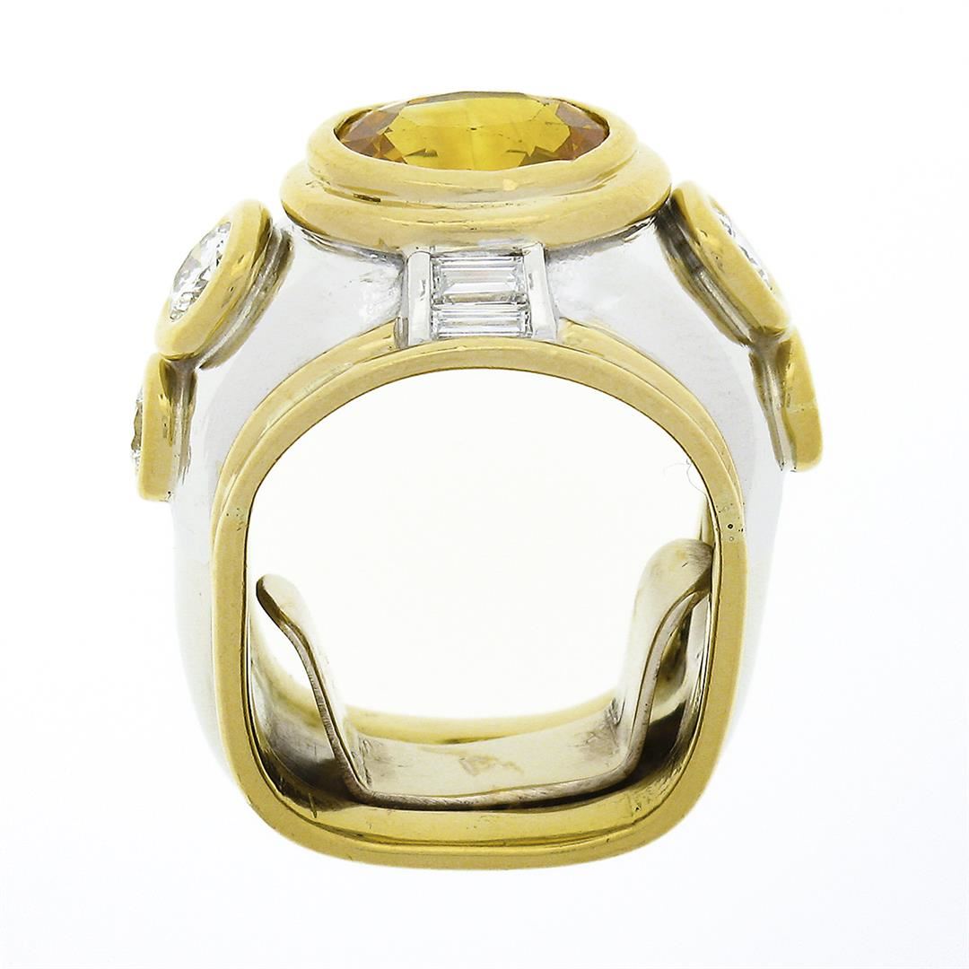 A vintage solid 18k white & yellow gold band ring, with 1 Gia certified oval cut natural yellow sapphire (2.75ct), and 4 round brilliant cut natural diamonds (F - VS1 ; 0.70ctw). & 4 baguette cut natural diamonds (F/G - VS1/VS2 ; 0.24ctw). The ring is size 4.0, weighs a total of 15.45 grams, and measures 16.70mm wide. Comes with all original relevant certifications.