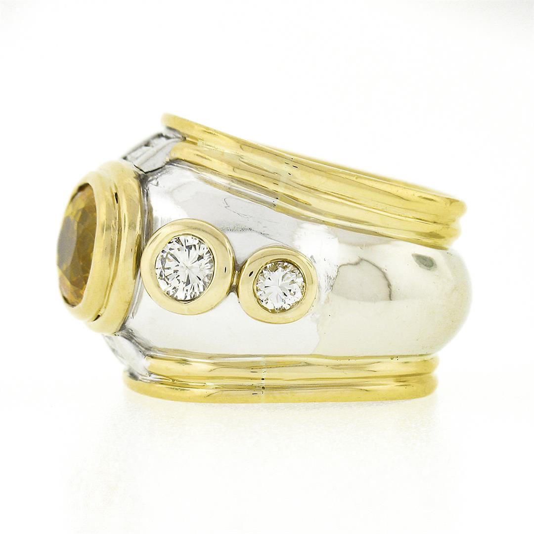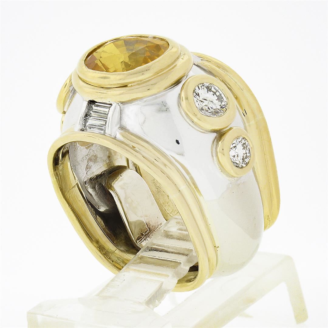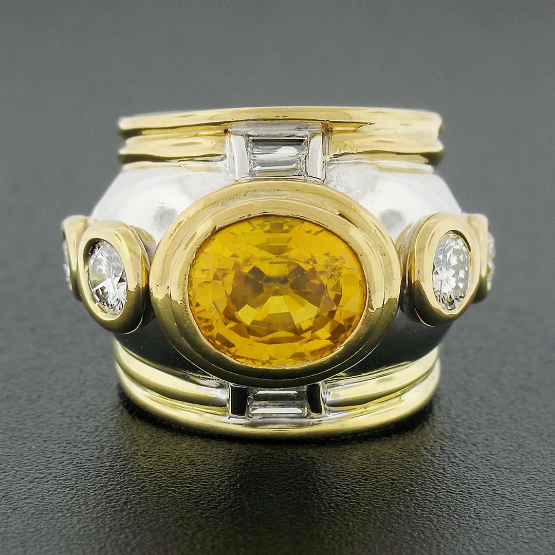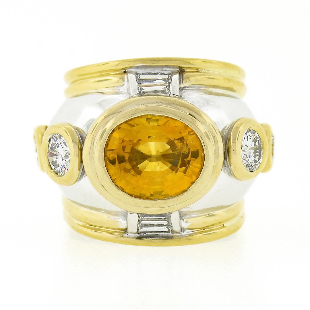 A vintage solid 18k white & yellow gold band ring, with 1 Gia certified oval cut natural yellow sapphire (2.75ct), and 4 round brilliant cut natural diamonds (F - VS1 ; 0.70ctw). & 4 baguette cut natural diamonds (F/G - VS1/VS2 ; 0.24ctw). The ring is size 4.0, weighs a total of 15.45 grams, and measures 16.70mm wide. Comes with all original relevant certifications.
