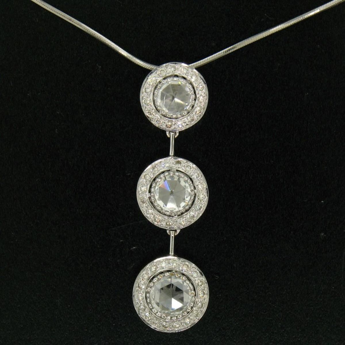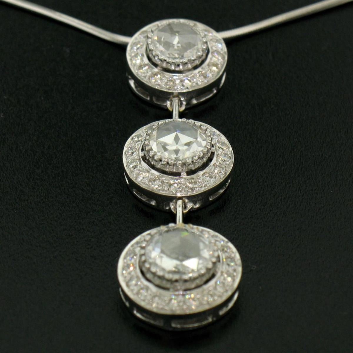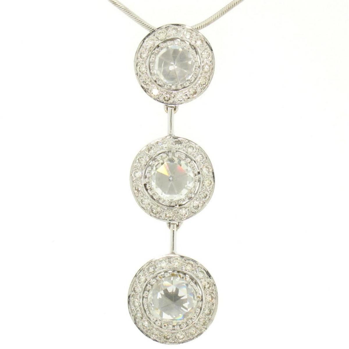 One Vintage 18K White Gold 2.59ctw 3 Rose Cut Diamond Drop Pendant w/ Triple Halo. Item Details: Material: Pendant: Solid 18k White Gold, Chain: Solid 14k White Gold, Weight: 11.5 Grams, Stone(s): (3) Natural Genuine Diamonds - Rose Cut - Multi-Prong Set - VS2/SI1 Clarity - D Color - 2.09ctw (approx.), (50) Natural Genuine Diamonds - Round Brilliant Cut - Pavé Set - SI1 Clarity - F Color - 0.50 ctw (approx.), Total Carat Weight: 2.59 (approx.), Chain Type: Serpentine Link, Chain Length: 20 Inches Clasp: Lobster Claw Width: 12.3mm Height: 43.5mm Thickness: 6.25mm Signature: Tecnigold 14K Italy V. O. (On the Chain) Condition: Amazing condition. Like new!