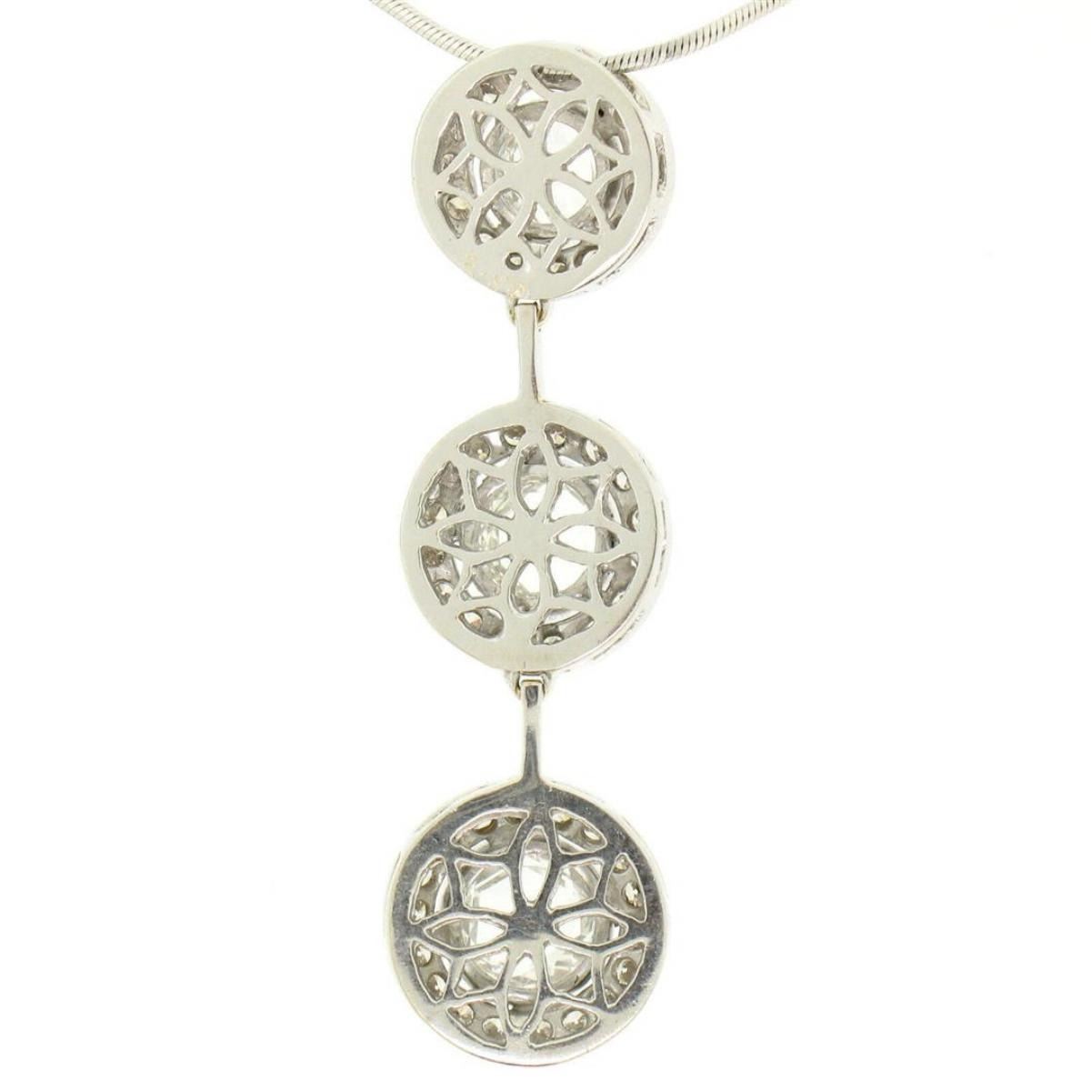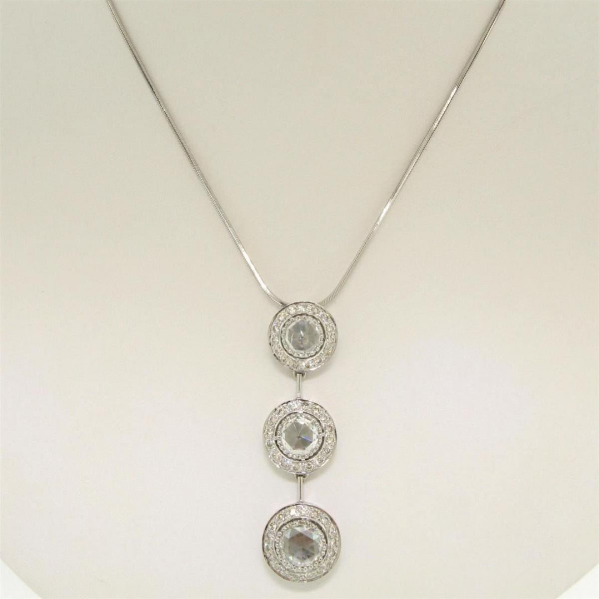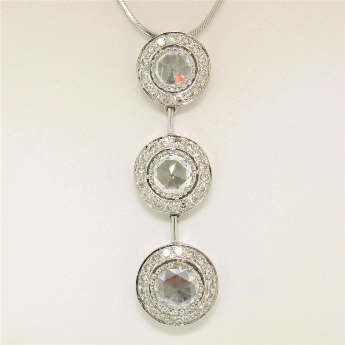 One Vintage 18K White Gold 2.59ctw 3 Rose Cut Diamond Drop Pendant w/ Triple Halo. Item Details: Material: Pendant: Solid 18k White Gold, Chain: Solid 14k White Gold, Weight: 11.5 Grams, Stone(s): (3) Natural Genuine Diamonds - Rose Cut - Multi-Prong Set - VS2/SI1 Clarity - D Color - 2.09ctw (approx.), (50) Natural Genuine Diamonds - Round Brilliant Cut - Pavé Set - SI1 Clarity - F Color - 0.50 ctw (approx.), Total Carat Weight: 2.59 (approx.), Chain Type: Serpentine Link, Chain Length: 20 Inches Clasp: Lobster Claw Width: 12.3mm Height: 43.5mm Thickness: 6.25mm Signature: Tecnigold 14K Italy V. O. (On the Chain) Condition: Amazing condition. Like new!