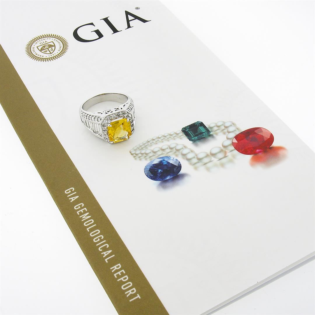 A vintage solid 18k white gold ring, with 1 gia certified Octagonal Step Cut orange yellow sapphire (4.05ct), and 12 baguette cut natural diamonds (F/G - VVS2/VS1 ; 2.30ctw), with 48 round brilliant cut natural diamonds (F/G - VS1/VS2 ; 0.60ctw). The ring is size 7.5, weighs a total of 10.21 grams, and measures 13.30mm wide. Comes with all original relevant certifications.