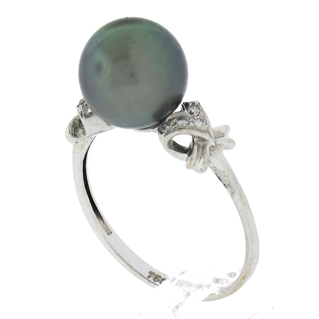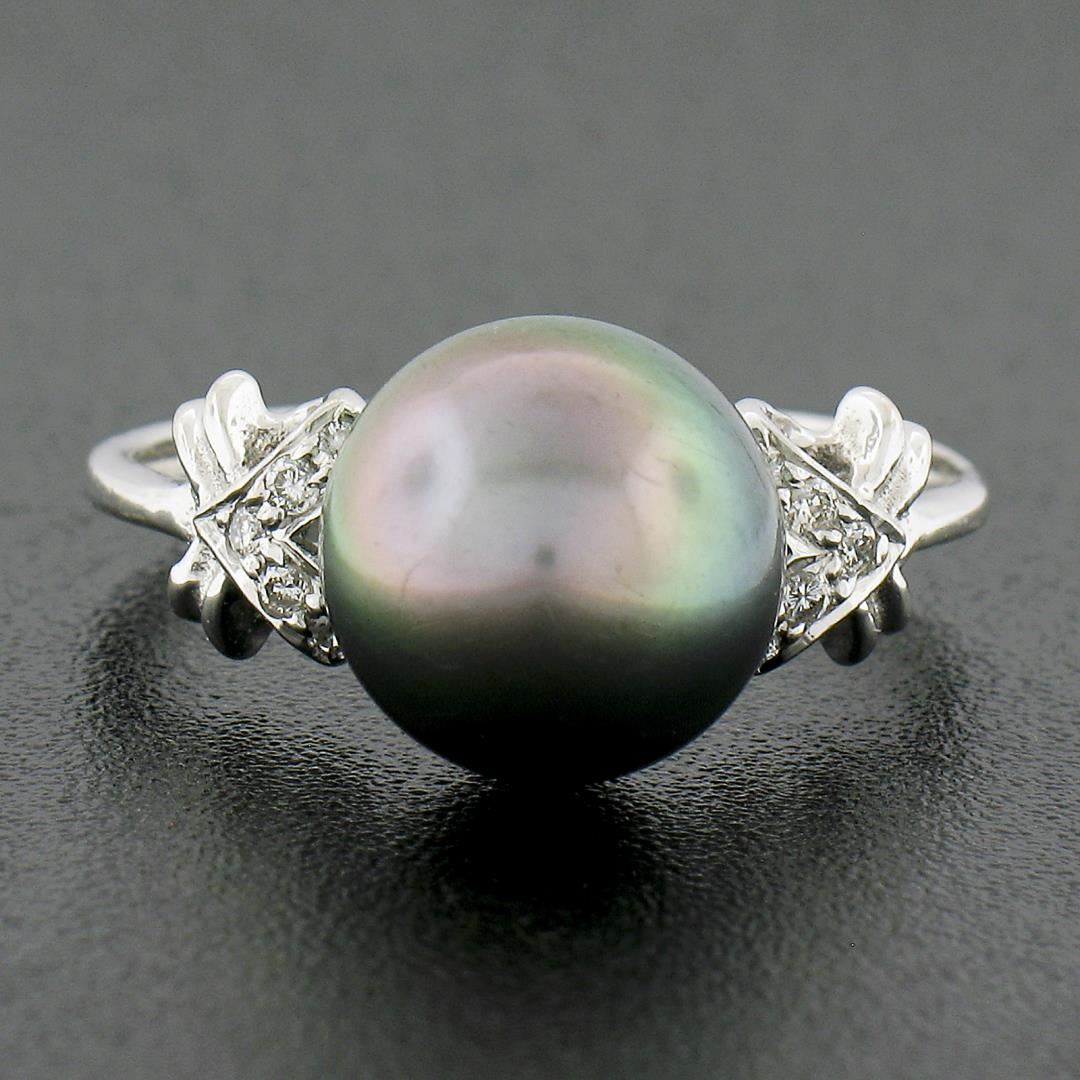 A vintage solid 18k white gold ring, with 1 round cultured tahitian pearl (9.1mm ), and 10 round cut natural diamonds. The ring is size 6.0, weighs a total of 2.62 grams, and measures 9.1mm wide.