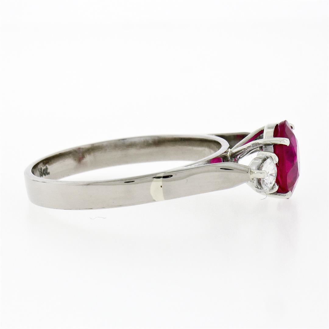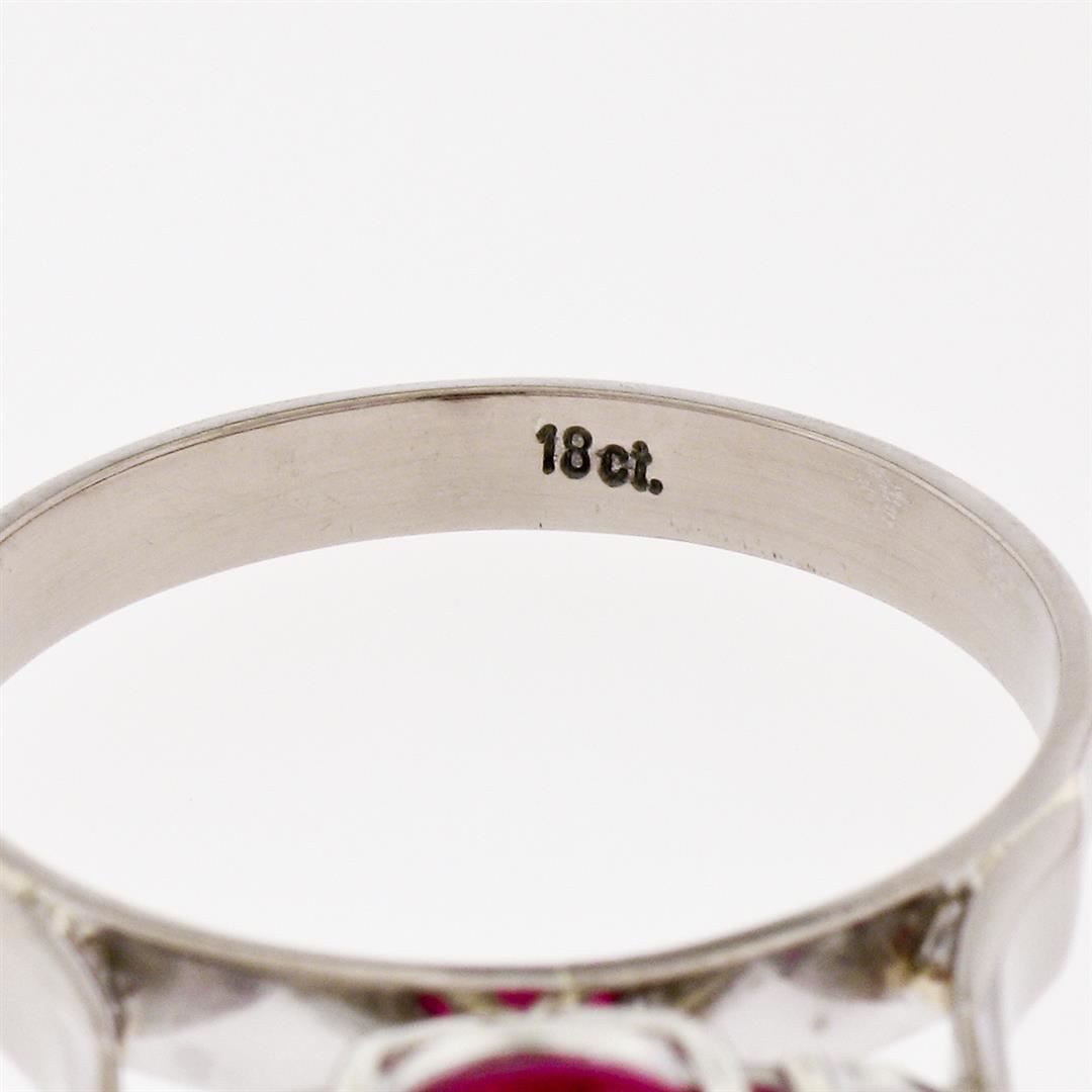A vintage solid 18k white gold 3 stones ring, with 1 old round cut red stone (7.50mm), and 2 round brilliant cut natural diamonds (F/G- VS1/VS2; 0.22ctw). The ring is size 8.0, weighs a total of 3.60 grams, and measures 7.50mm wide.