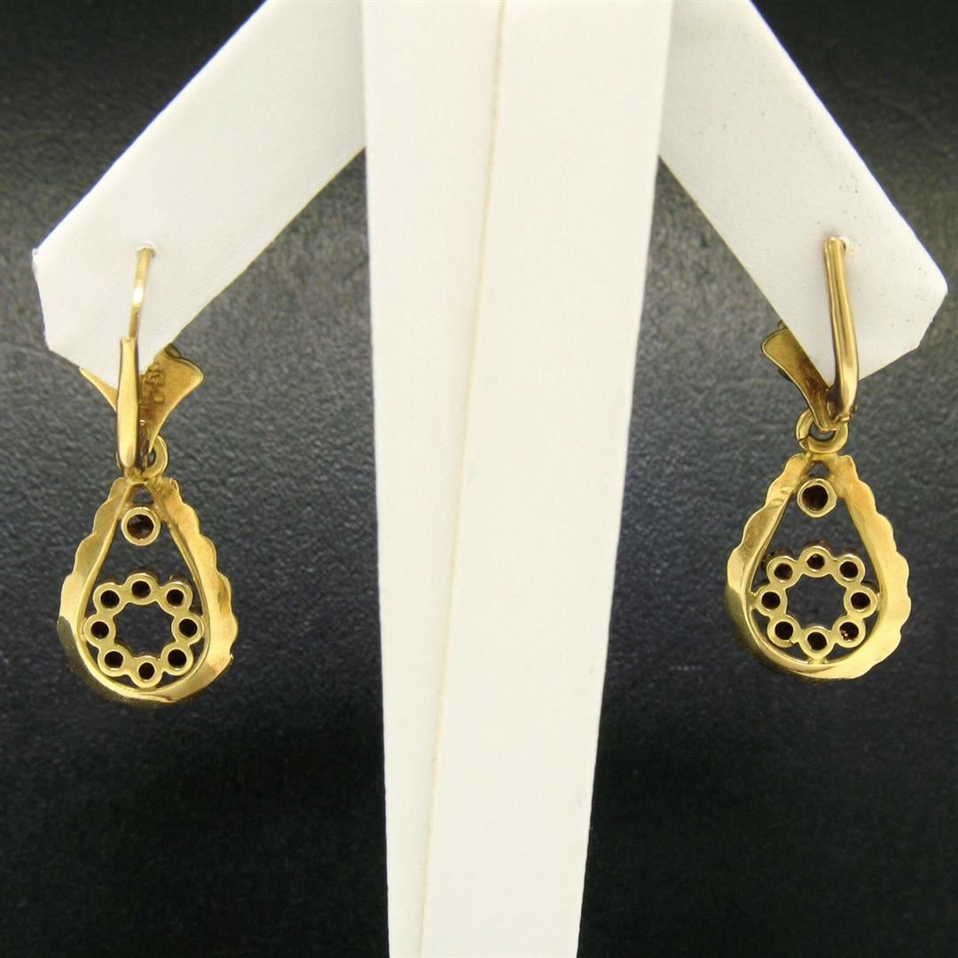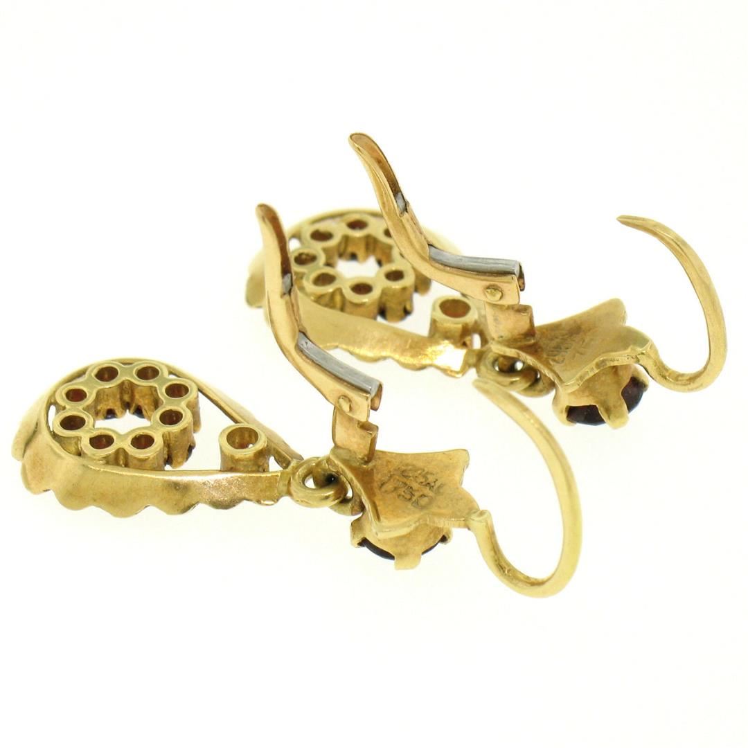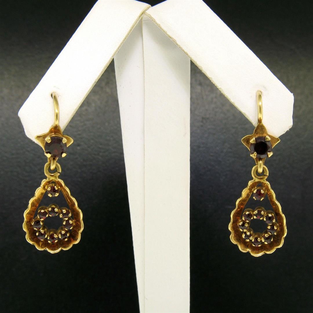 One Vintage 18K Yellow Gold 1.0ctw Pear Shape Garnet Dangle Drop Lever Back Earrings. Item Details: Material: 18k yellow gold, Weight: 5.2 Grams, Stone(s): (20) Natural Genuine Garnets - Prong Set - Round Cut - Deep Red Color - 1.00ctw (approx.), Total Carat Weight: 1.00 (approx.), Backing: Lever Back (Pierced ears required.), Width: 12mm, Height: 33mm, Thickness: 3mm projection off the ear Dangle Length: 19mm Condition: Vintage, Original patina, perfect condition!