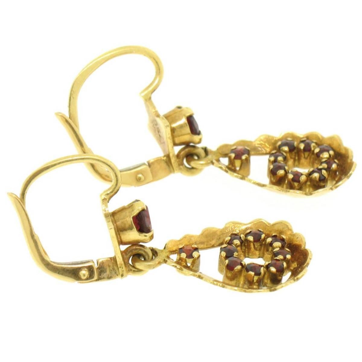 One Vintage 18K Yellow Gold 1.0ctw Pear Shape Garnet Dangle Drop Lever Back Earrings. Item Details: Material: 18k yellow gold, Weight: 5.2 Grams, Stone(s): (20) Natural Genuine Garnets - Prong Set - Round Cut - Deep Red Color - 1.00ctw (approx.), Total Carat Weight: 1.00 (approx.), Backing: Lever Back (Pierced ears required.), Width: 12mm, Height: 33mm, Thickness: 3mm projection off the ear Dangle Length: 19mm Condition: Vintage, Original patina, perfect condition!