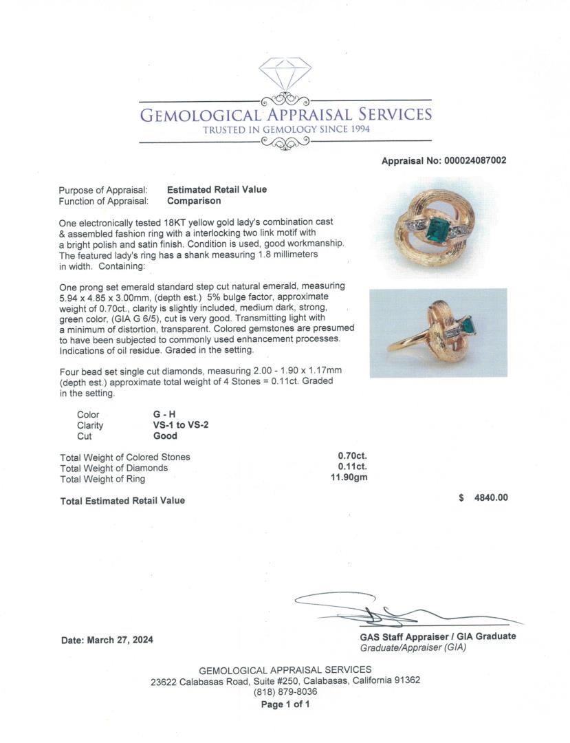 Vintage 18K Yellow Gold Emerald & Diamond Ring containing one emerald cut emerald weighing approximately 0.70 cts and four diamonds weighing approximately 0.11 cts Total weight is 11.9 gm. Estimated retail value $4,840.