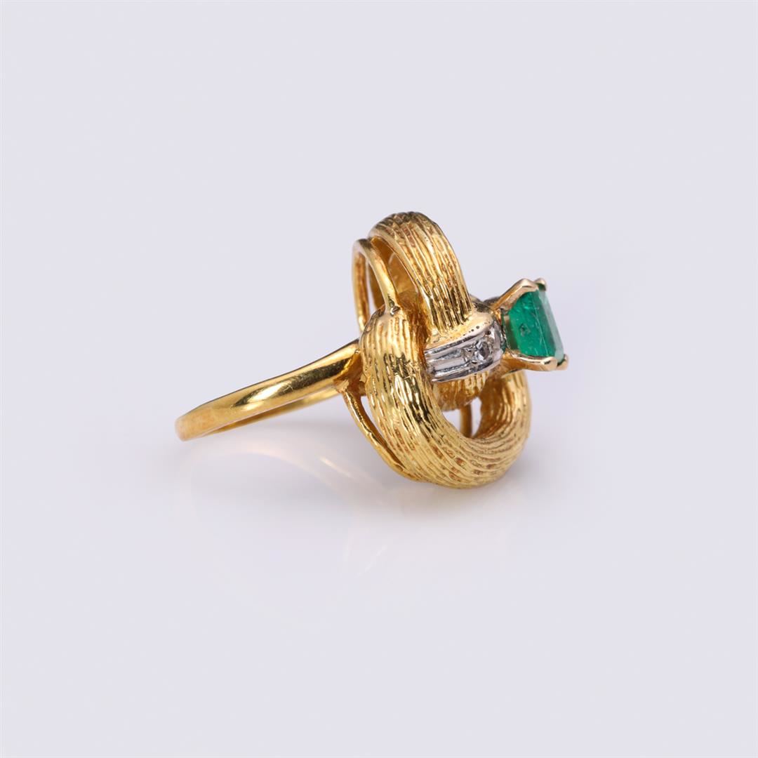 Vintage 18K Yellow Gold Emerald & Diamond Ring containing one emerald cut emerald weighing approximately 0.70 cts and four diamonds weighing approximately 0.11 cts Total weight is 11.9 gm. Estimated retail value $4,840.