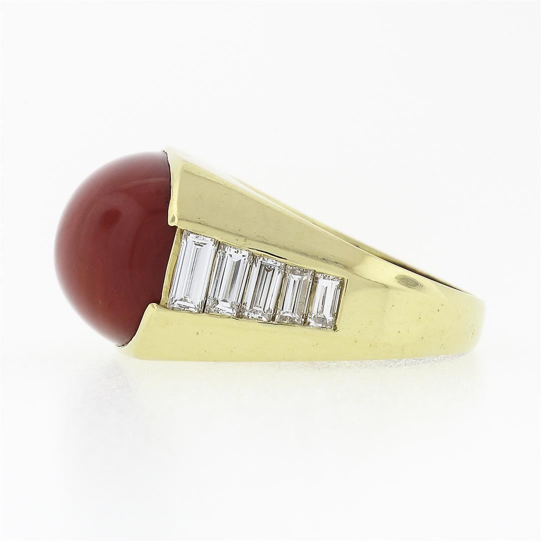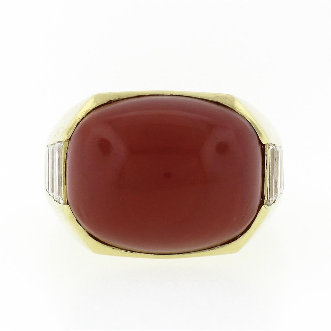 A vintage solid 18k yellow gold cocktail ring, featuring 1 Gia certified cushion cabochon cut natural coral(15.00 x 11.88 x 6.70 mm), accented with 10 baguette cut natural diamonds ( F/G - VVS2/VS1 ; 1.20ctw). The ring is size 5, weighs a total of 9.75 grams, and measures 12.8mm wide. Comes with all original relevant certifications.