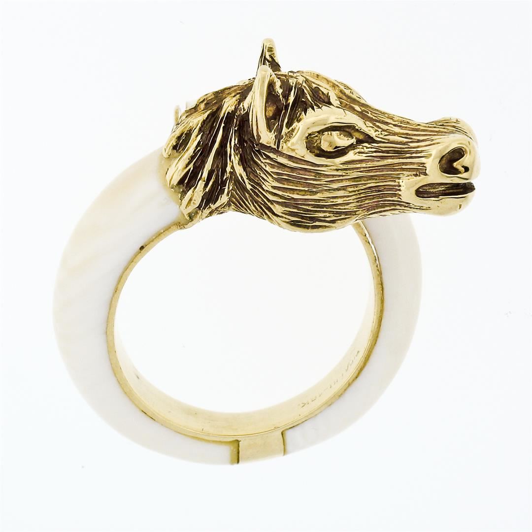 A vintage solid 18k yellow gold horse head bypass ring, with 2 custom cut natural horn. The ring is size 7, weighs a total of 9.0 grams, and measures 14.25mm wide.