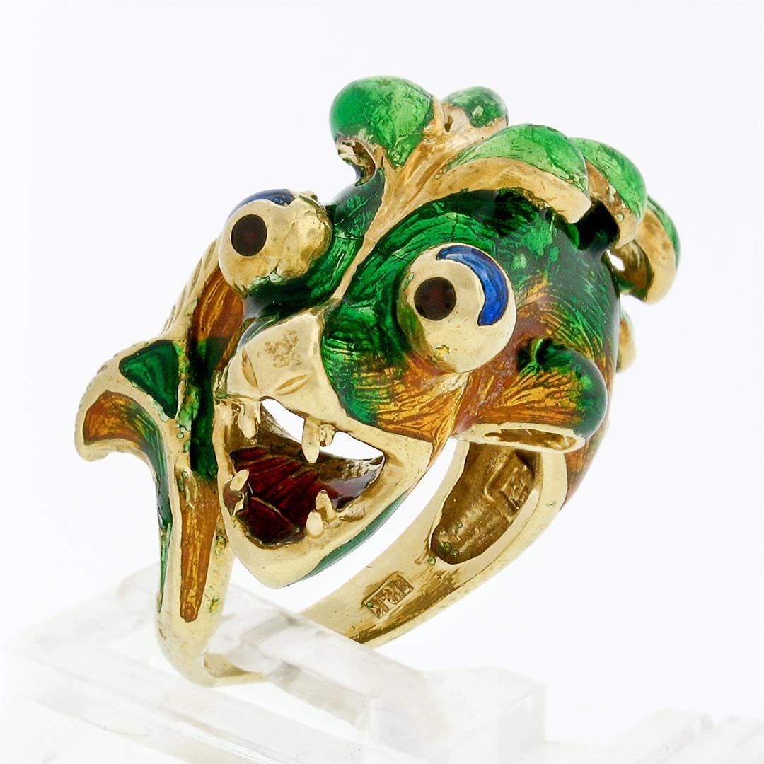 A vintage solid 18k gold dragon or fish band ring, with multi color enamel work. The ring is size 7, weighs a total of 15.16 grams, and measures 15.7mm wide.