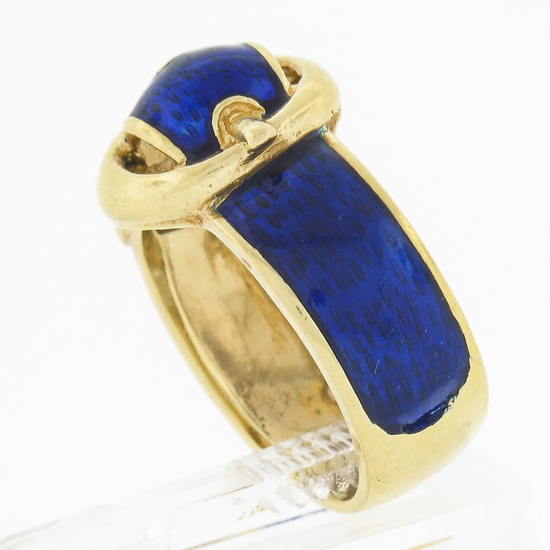 Vintage 18K Yellow Gold Royal Blue Enamel w/ Textured Gold Work Buckle Band Ring