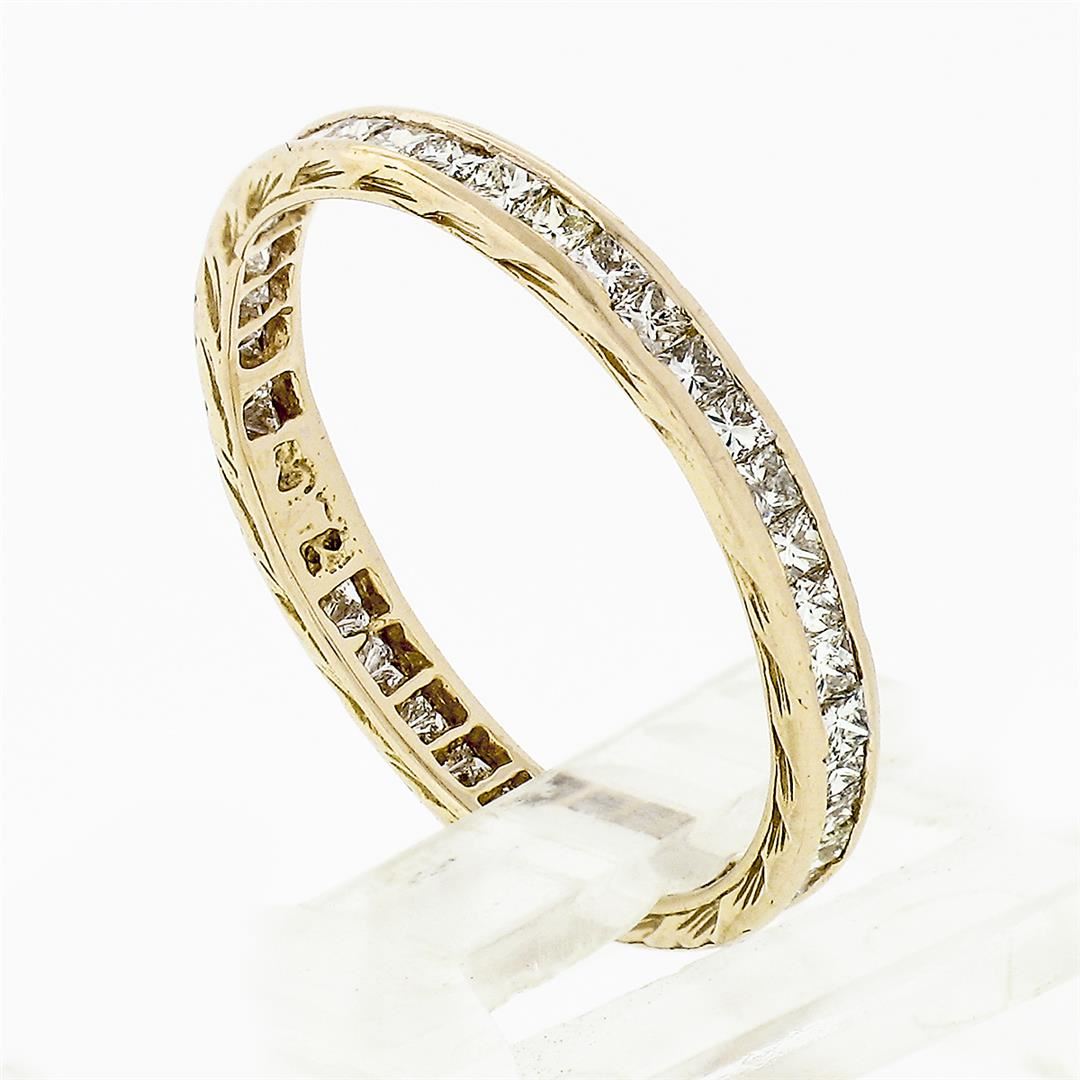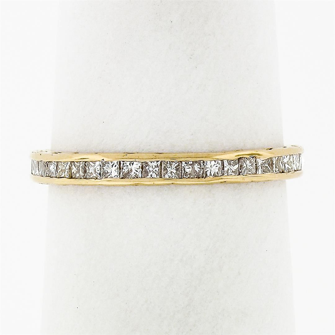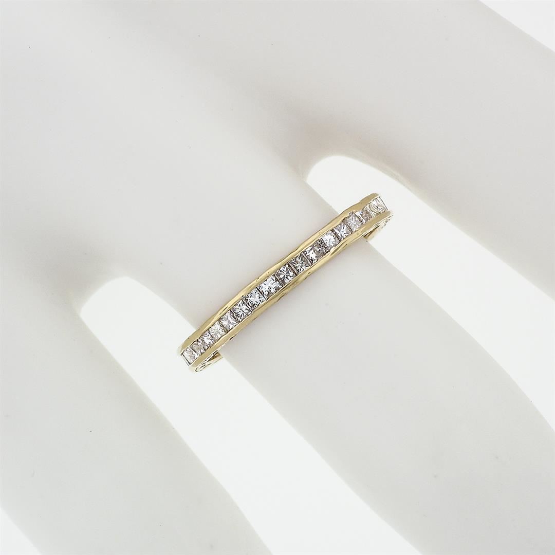 A vintage solid 18k yellow gold eternity band ring, with 36 princess cut natural diamonds (H/I - VS2/SI1 ; 0.85ctw). The ring is size 6.0, weighs a total of 1.21 grams, and measures ##mm wide.