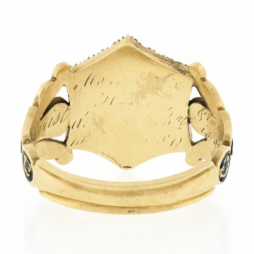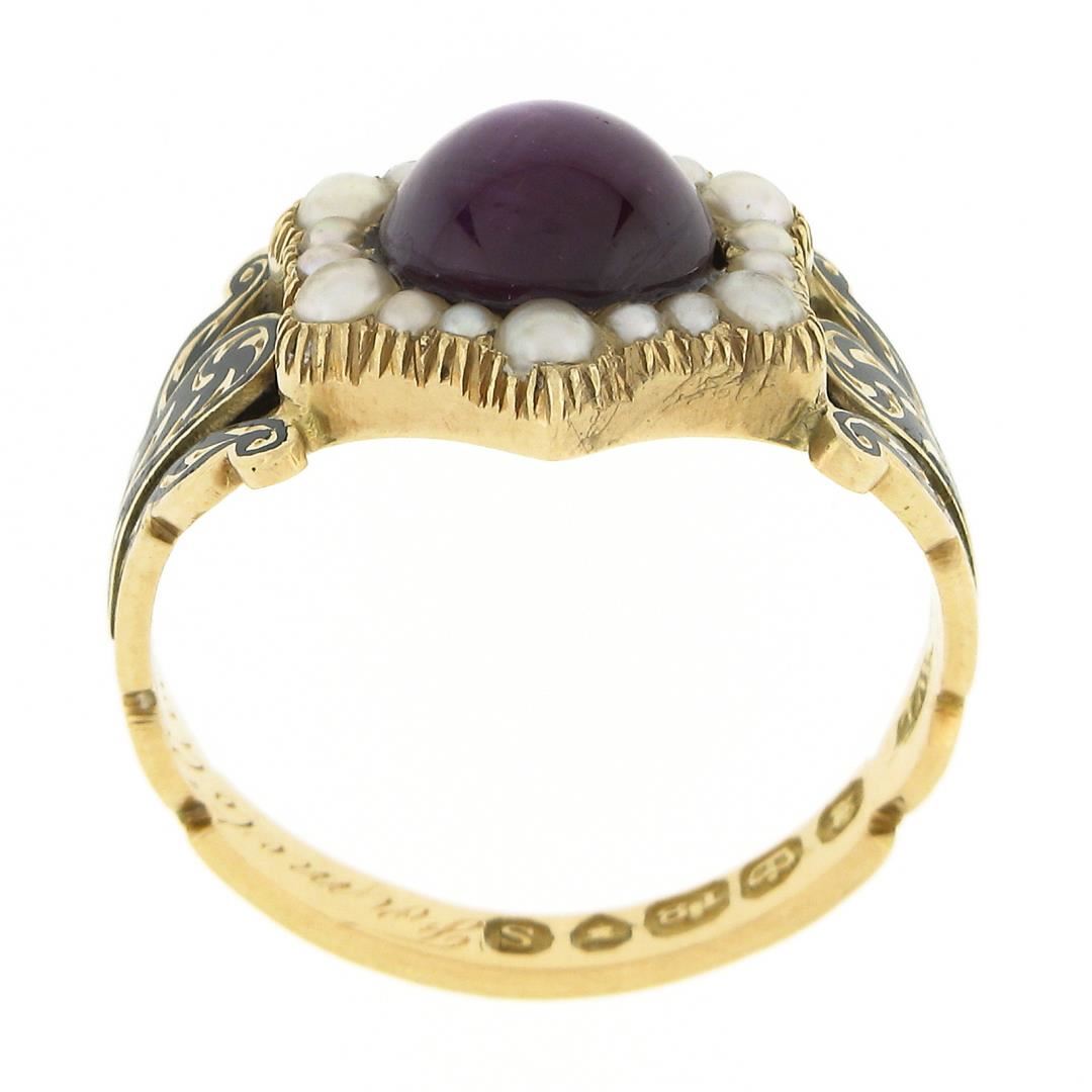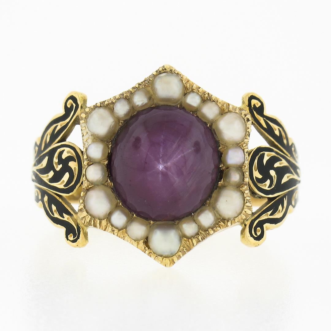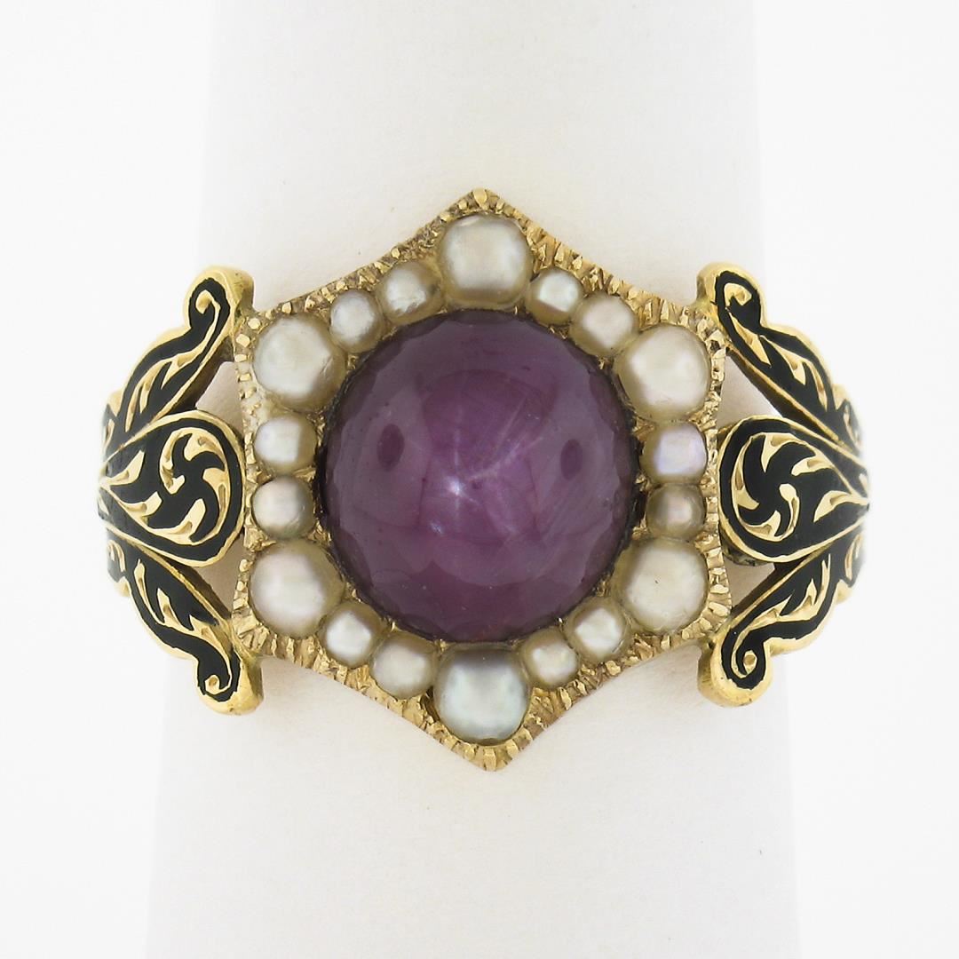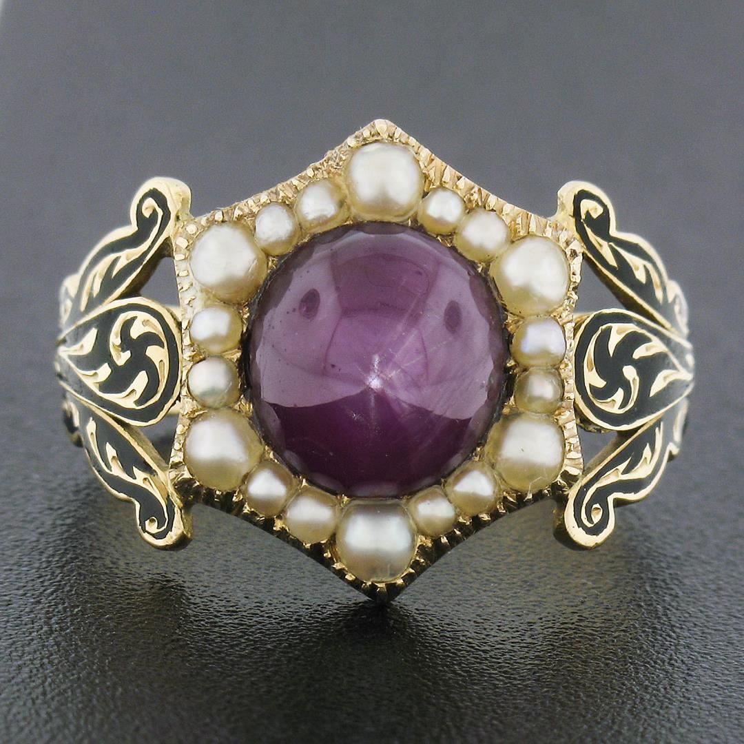 Vintage 18k Gold 3.5 ctw Cabochon Star Ruby & Pearl Halo w/ Black Enamel Band Ri
