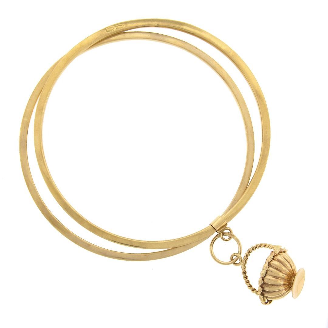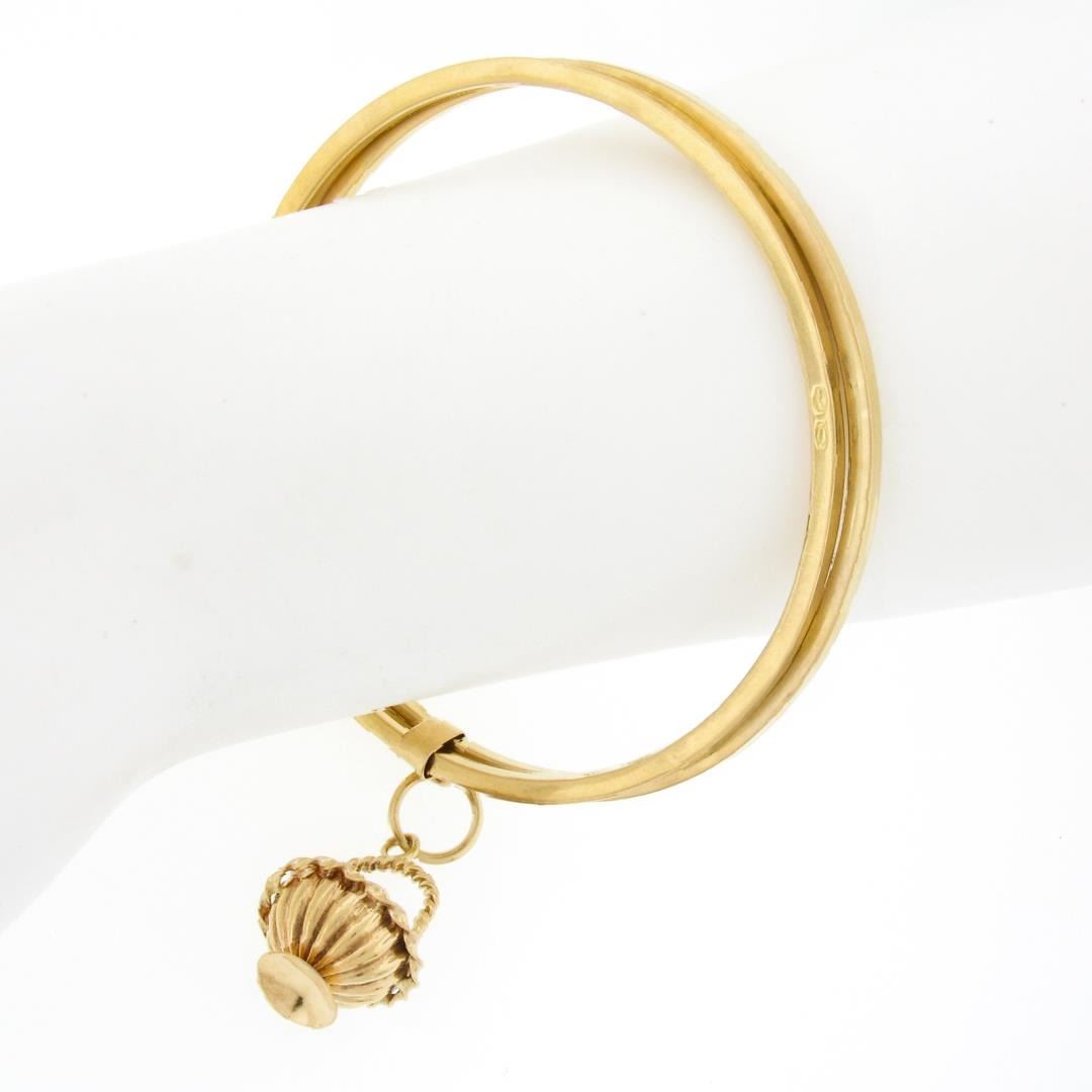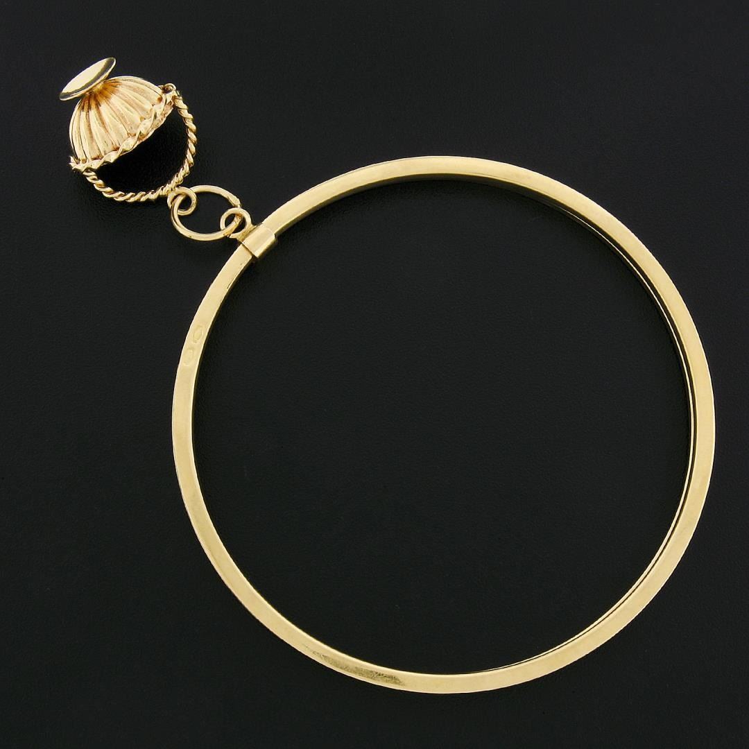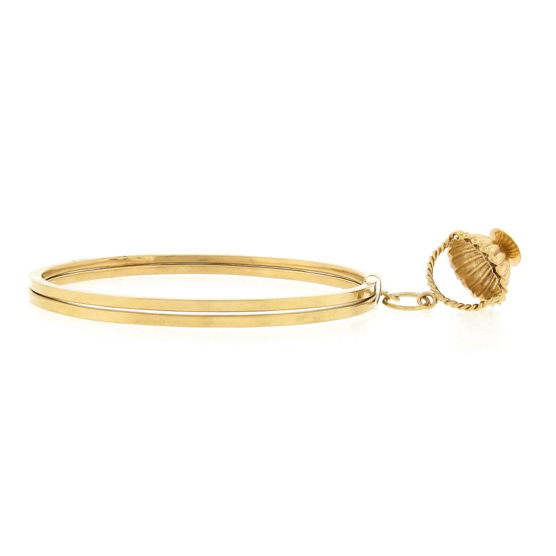 A vintage solid 18k yellow gold charm bangle bracelet. It weighs a total of 15.70 grams, measures 4.50mm wide, and measures 7.75 inches in length.