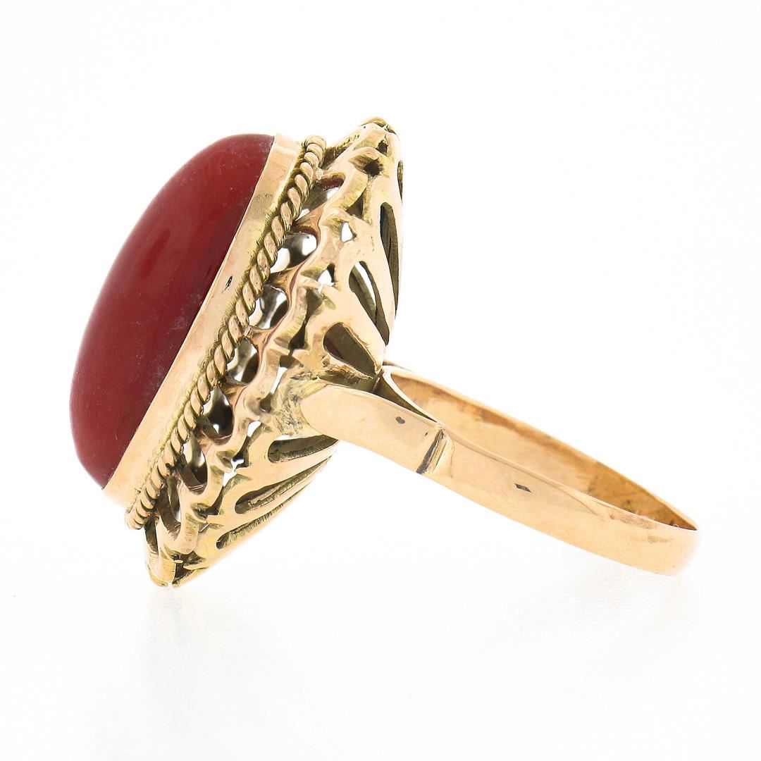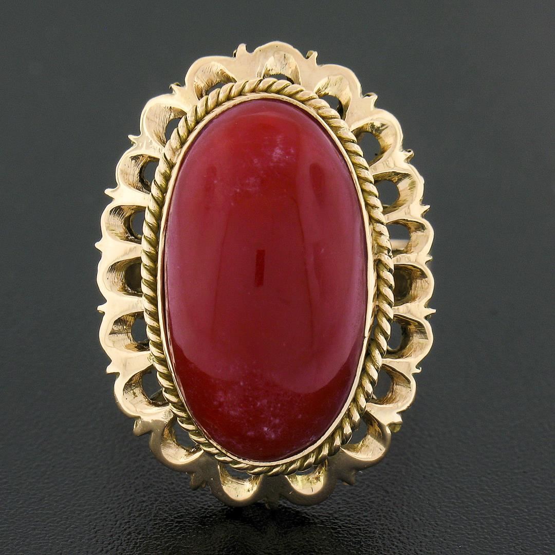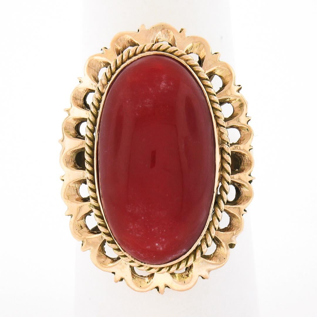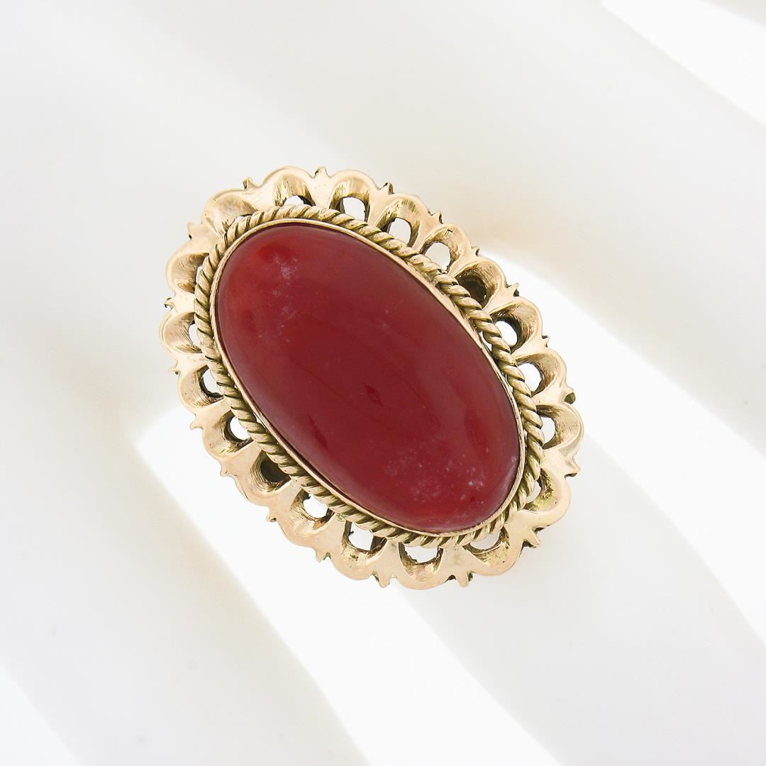 A vintage solid 18k yellow gold ring, with 1 GIA graded oval cabochon cut natural coral (). The ring is size 7.0, weighs a total of 7.10 grams, and measures 26.1mm wide. Comes with all original relevant certifications.19.71x10.98mm