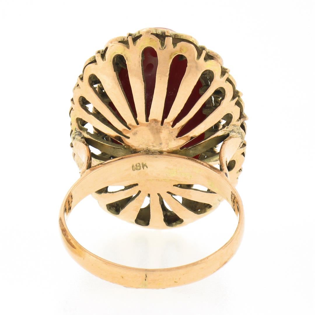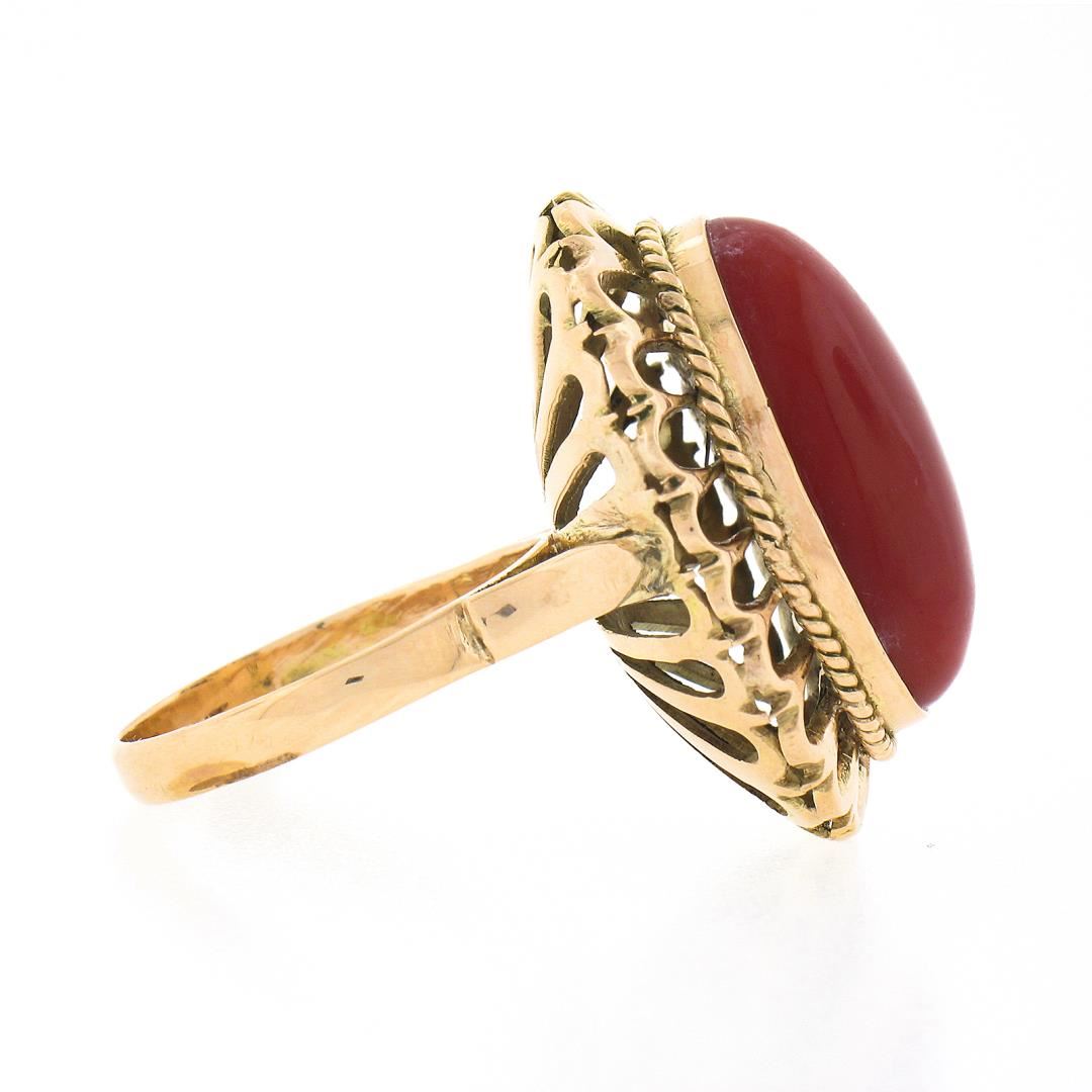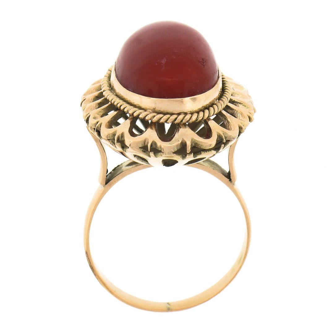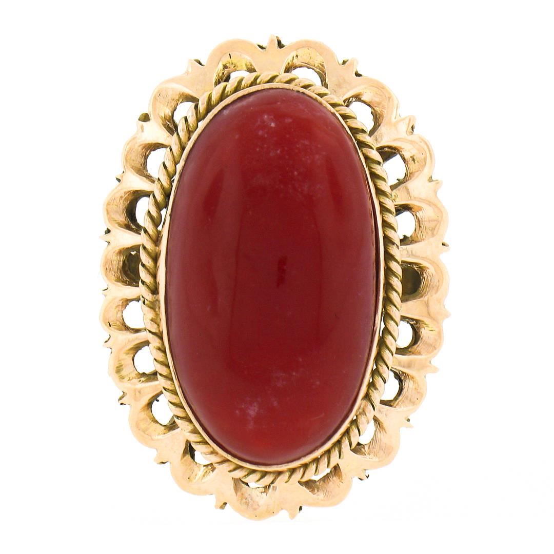 A vintage solid 18k yellow gold ring, with 1 GIA graded oval cabochon cut natural coral (). The ring is size 7.0, weighs a total of 7.10 grams, and measures 26.1mm wide. Comes with all original relevant certifications.19.71x10.98mm