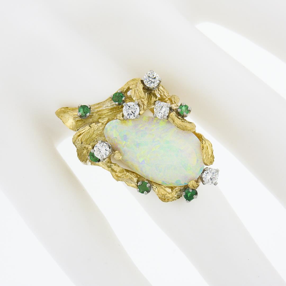 A vintage 18k yellow gold cocktail ring, with 1 GIA graded pear cabochon cut natural opal ( 20.03x11.4mm ), and 5 round brilliant cut natural diamonds (E/F - VS1 ; 0.60ctw), with 5 round brilliant cut natural emeralds (0.22ctw). The ring is size 6.0, weighs a total of 12.76 grams, and measures 34.30mm wide.Comes with all original relevant certifications.